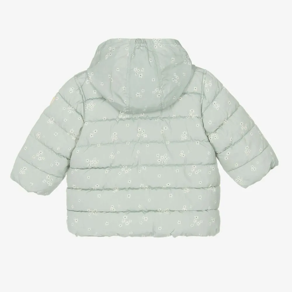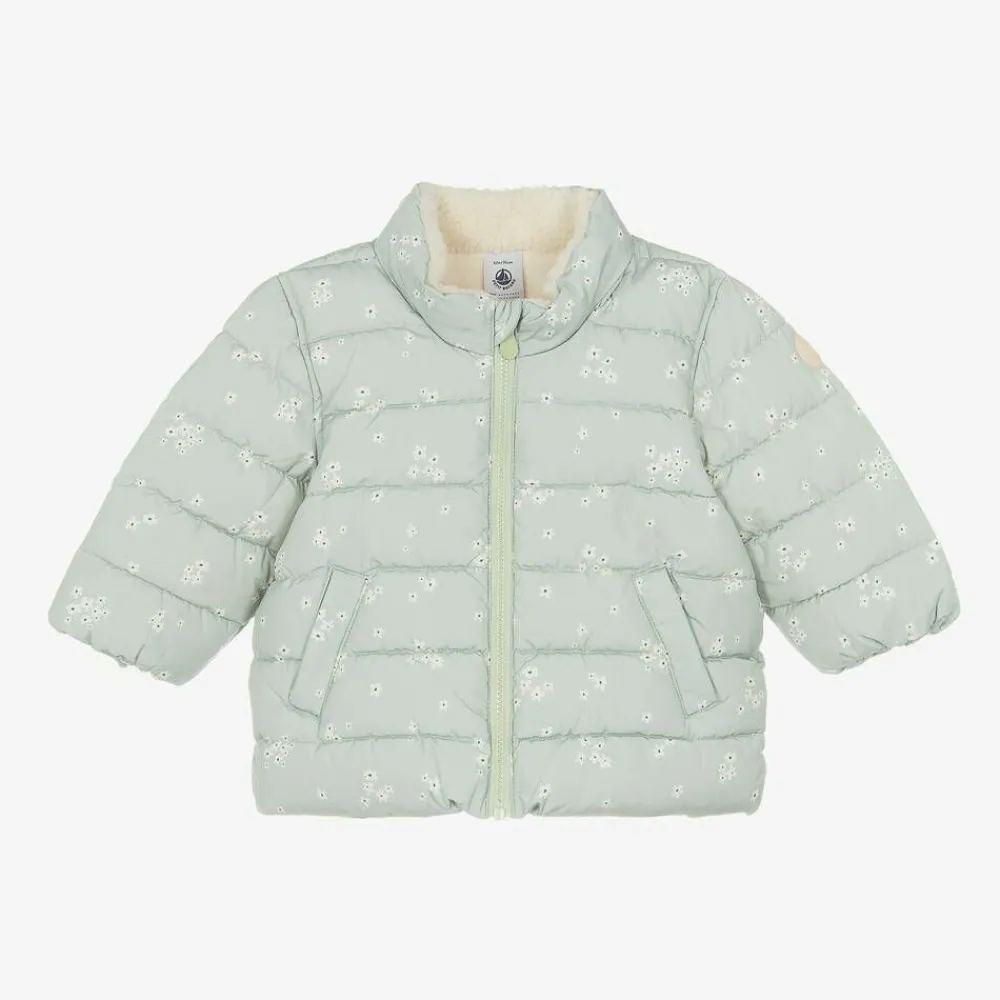 Pretty pale green puffer coat for little girls by French brand Petit Bateau, with a white floral pattern and mid-weight padding. Smooth and silky, it has a useful, fold-away hood in the cosy, stand-up collar and a super warm, fleecy lining. The cuffs are elasticated to keep the chilly weather out and there are slanted pockets on the front. The front zip fastening has a protective chin guard. This coat contains at least 50% of recycled polyester.