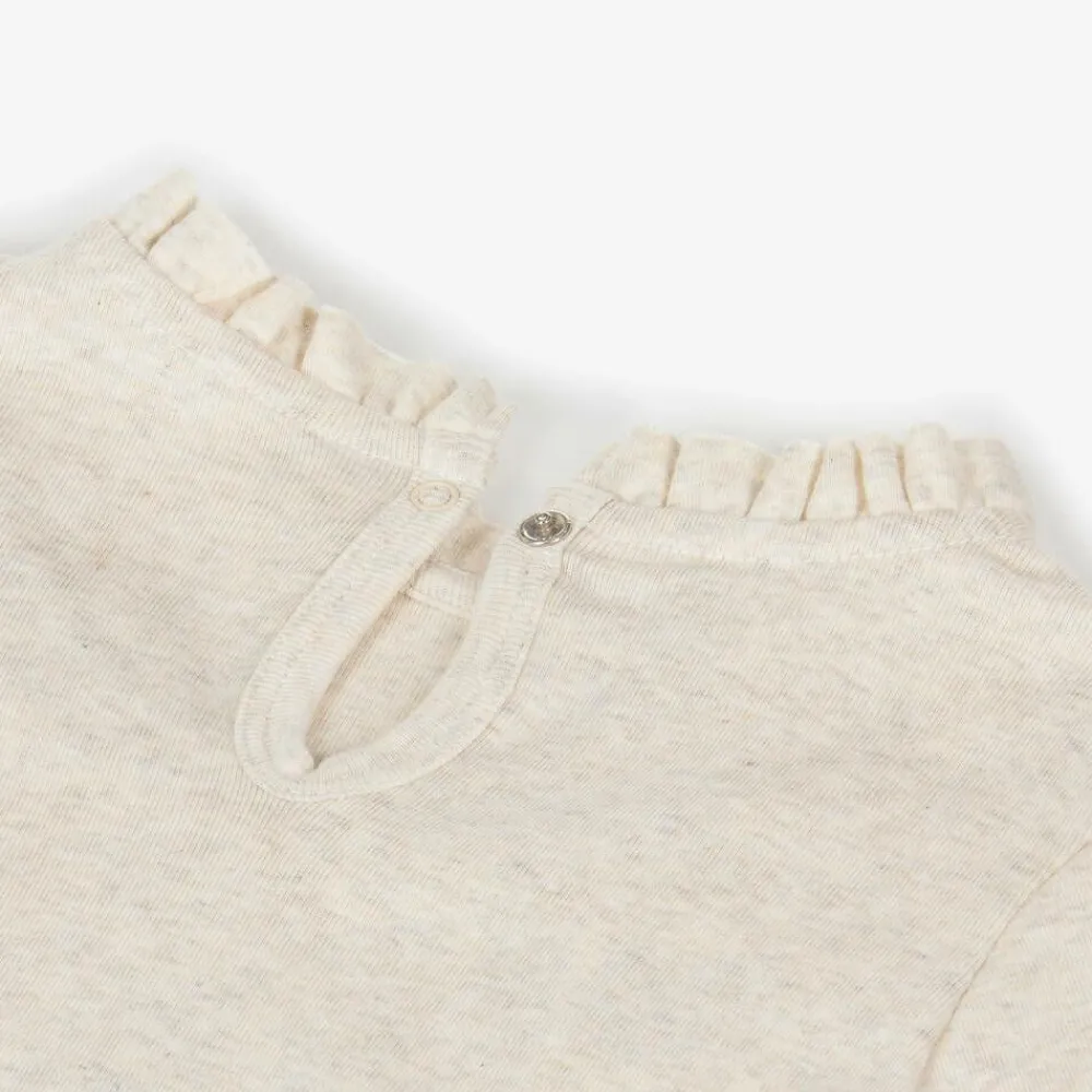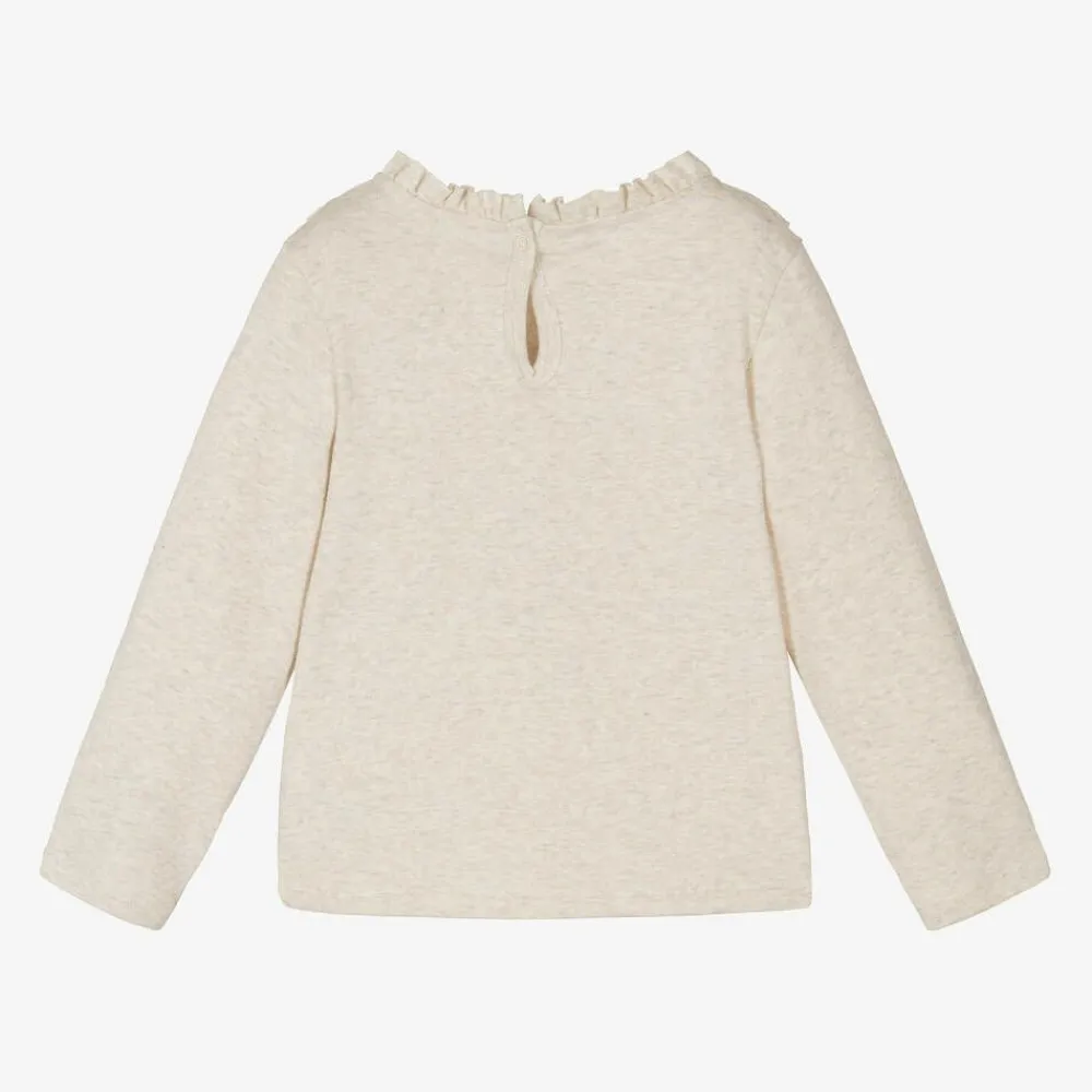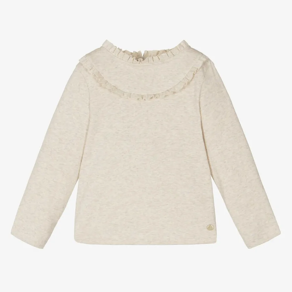 Timelessly stylish beige marl top for girls by French brand Petit Bateau, made in soft organic cotton jersey. This soft long-sleeved top has sweet ruffle detailing on the neckline and fastens with a popper on the back.