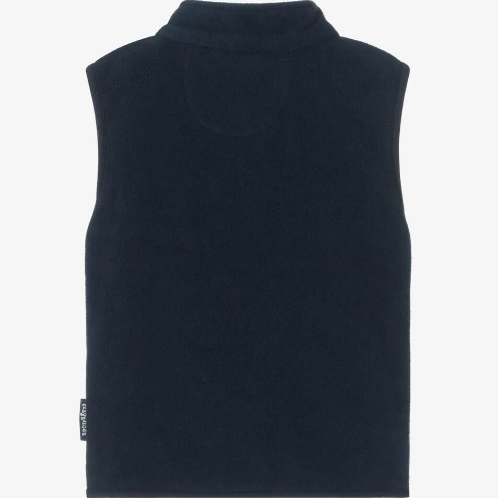 Navy blue gilet for boys and girls from Playshoes, made from soft fleece with matching trims. It has a high neck, a chin guard on the top of the zipper and two useful zipped pockets. Practical and versatile for everyday, it also makes a cosy layering piece when the season changes.