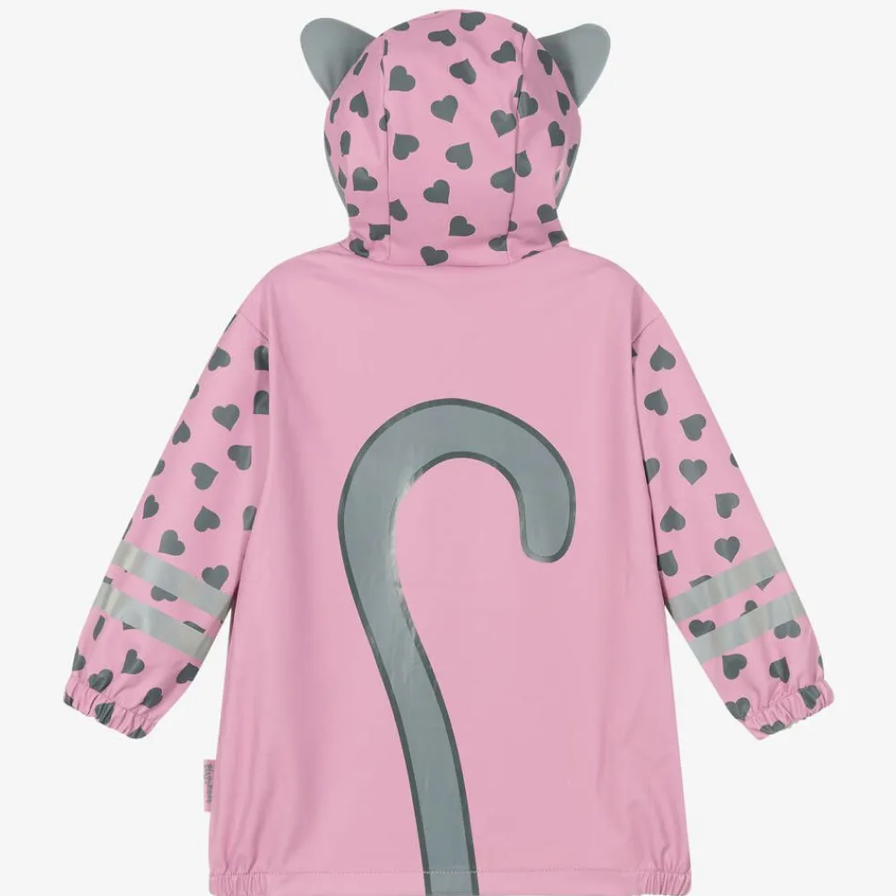 Girls pink hooded zip-up raincoat by Playshoes, with grey heart prints. The fixed, mesh-lined hood has a grey trim with cute padded ears and an animal face print on the front. Waterproof and lightweight, it has light reflective stripes on the sleeves for better visibility and elasticated panels on the cuffs and hem to keep the cold out. There are two pockets on the front and a playful grey tail print on the back.