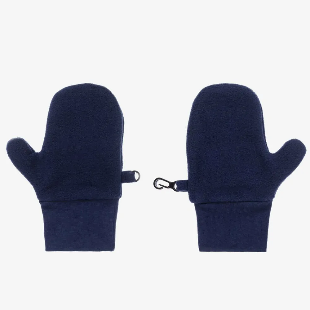 Girls and boys navy blue mittens by Playshoes. Soft and cosy, they are made in breathable, anti-pilling fleece with comfortable cotton jersey cuffs. They have handy clips to keep them together when not in use.