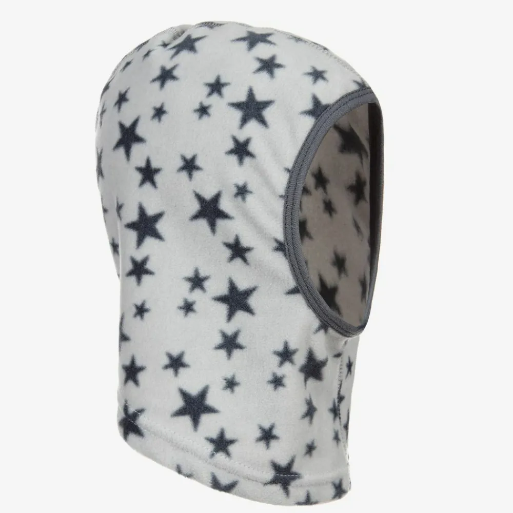 Grey star print balaclava for girls and boys by Playshoes. Warm and cosy for the cold weather, it is made in soft fleece with a jersey trim.