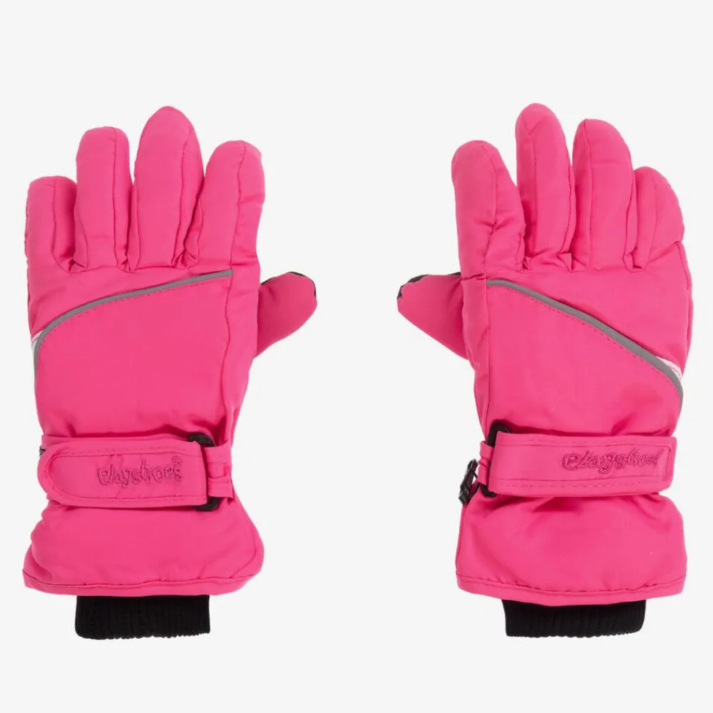 Bright pink ski gloves for girls by Playshoes, with reflective trims. Warm but lightweight with 3M Thinsulate⢠insulation, they are waterproof and breathable. Lined in soft, warm fleece, they have comfortable ribbed cuff, adjustable velcro straps and hard-wearing, black slip-resistant palms.