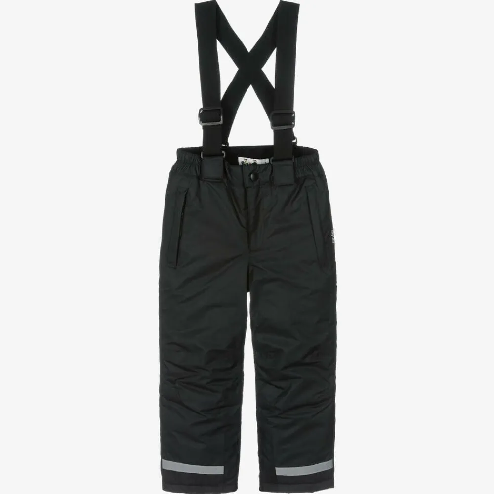 Black salopettes for boys and girls by Playshoes, with removable and adjustable black elasticated shoulder braces. Lightly padded for optimum warmth without the extra weight, they are also breathable but windproof and waterproof with the taped seams. The waistband and internal gaiters are elasticated to keep snow out and there are cuff zip and popper on the side to help when dressing. There are reflective trims for improved visibility, front zip and popper fastening and two zipped pockets.