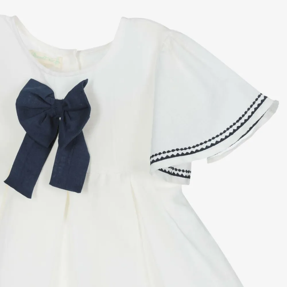 An ivory dress for girls by Powell Craft, made in a cool and comfortable blend of linen and cotton. Styled with a pleated skirt, this charming dress has a decorative navy blue bow on the front and pretty flutter sleeves trimmed with delicate blue embroidery. It is fully lined with lightweight voile and has neat button fastenings on the back with a sash that can be tied into a bow.