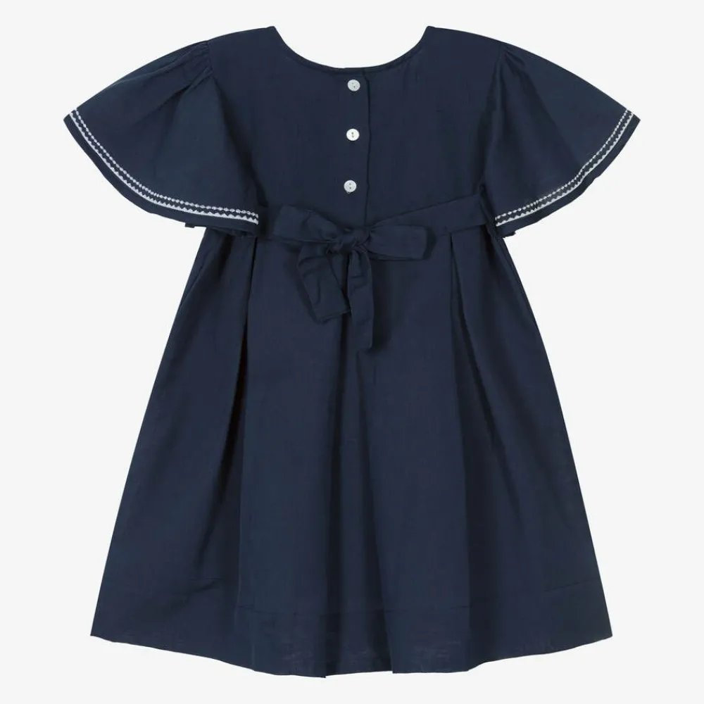 A navy blue dress for girls by Powell Craft, made in a cool and comfortable blend of linen and cotton. Styled with a pleated skirt, this charming dress has a decorative ivory bow on the front and pretty flutter sleeves trimmed with delicate ivory embroidery. It is fully lined with lightweight voile and has neat button fastenings on the back with a sash that can be tied into a bow.