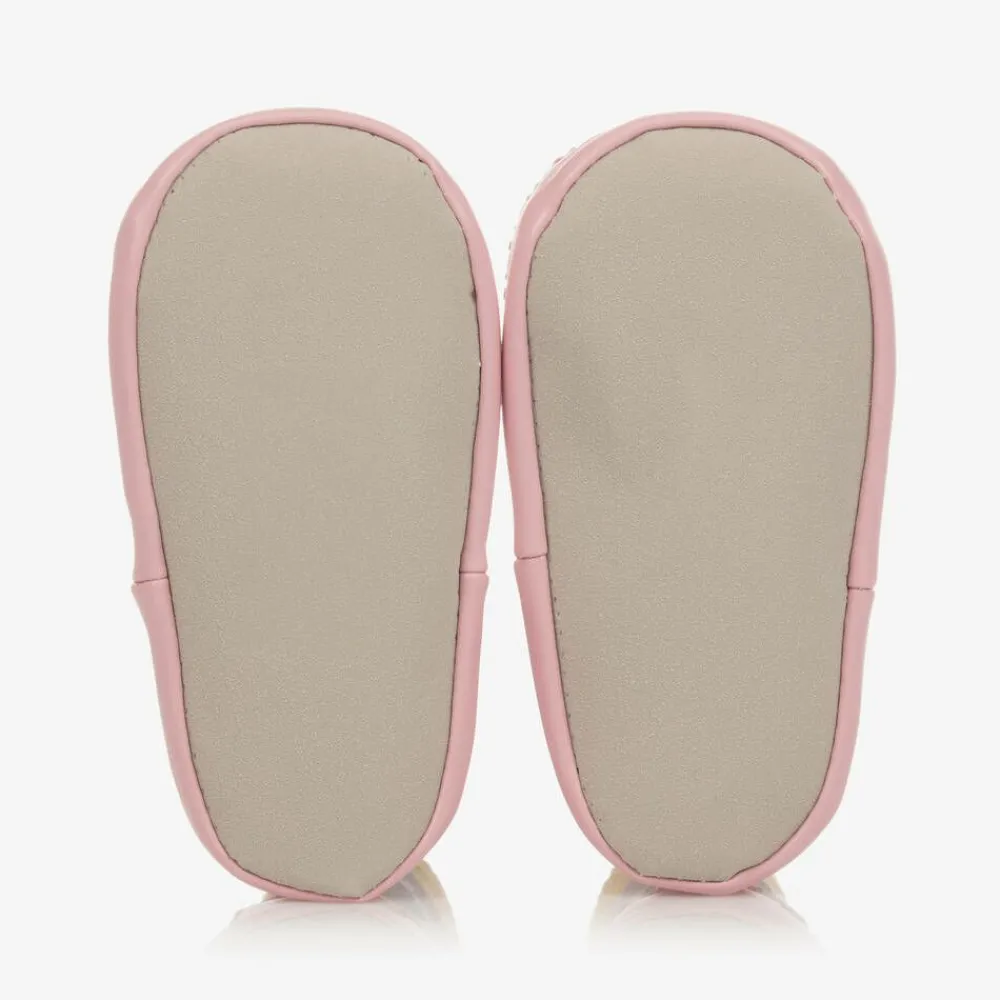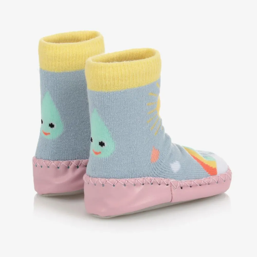 Pink and blue moccasin slipper socks for younger girls from Powell Craft. Great for keeping feet cosy, the base is made from non-slip faux leather and the cotton-rich socks have a colourful sun and rainbow motif.