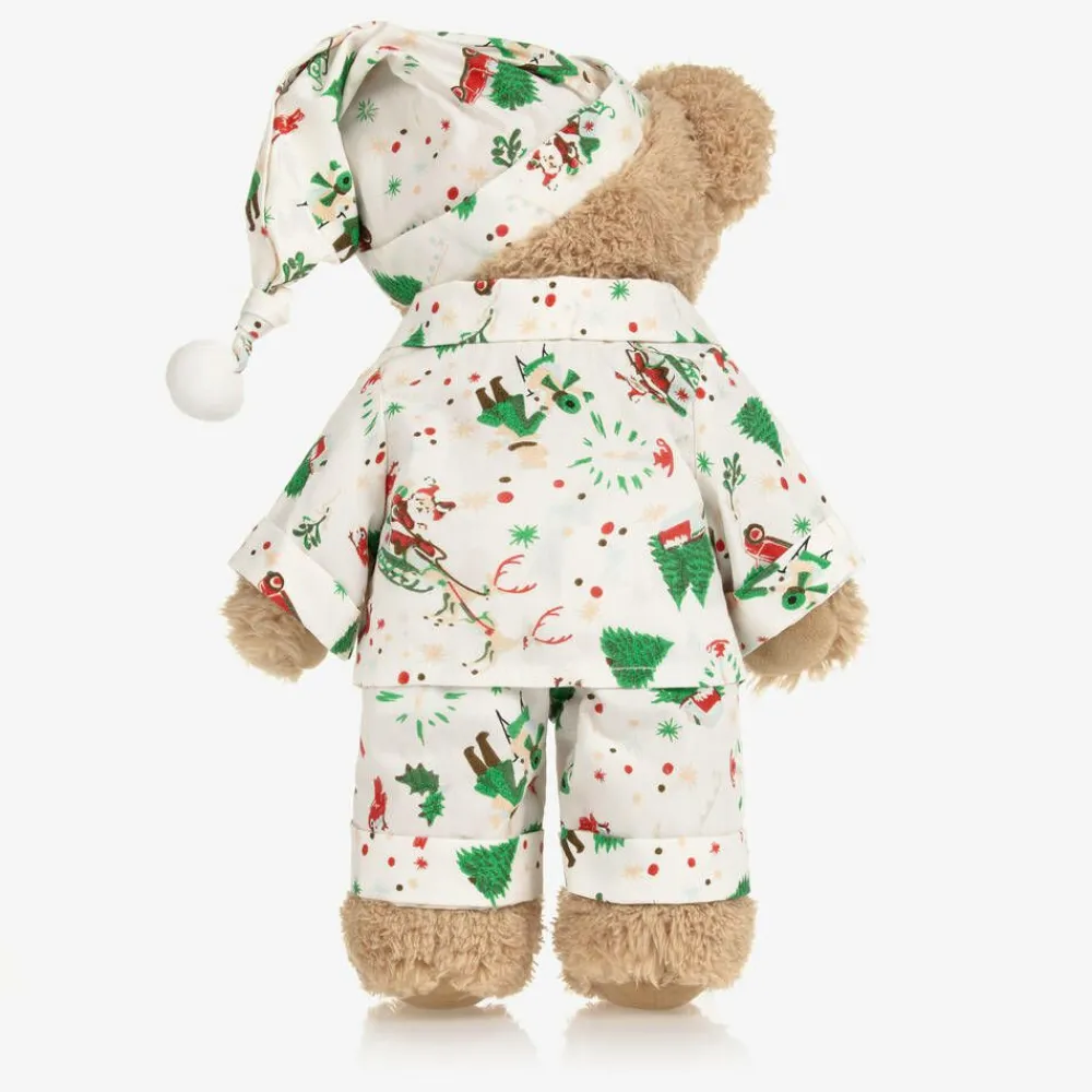 Lovely to cuddle, this gorgeous Powell Craft teddy bear has soft faux fur, beaded eyes and a stitched nose. He is wearing festive print pyjamas, decorated with Christmas trees and Father Christmas on his sleigh and a sweet nightcap. For a fun coordinating bedtime look, matching pyjamas are available from the designer's collection for your little one to wear.
