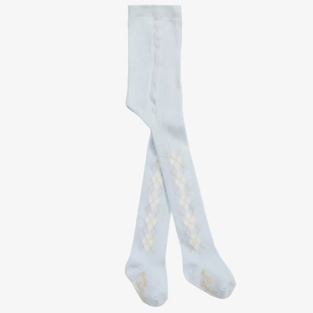 Lovely powder blue tights for girls by British brand, Pretty Originals. In a cute, preppy style, they are knitted in soft cotton for comfort and have a beige and ivory check design.