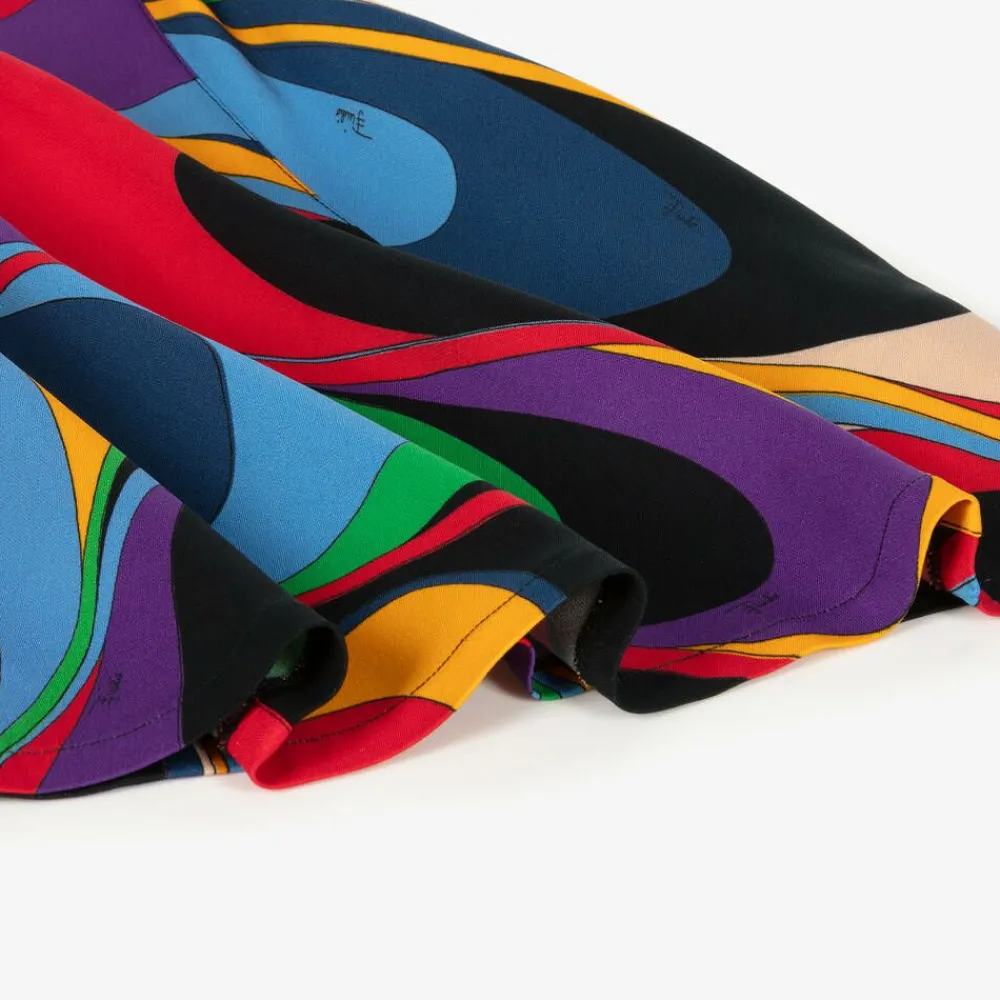 This striking dress for little girls is by luxury label Pucci, designed in contrasting shades of purple, red and blue against a black background. Characterised by the Italian brand's Onde swirls, this bold, abstract dress is made in lightly textured viscose fabric with a touch of stretch. It has pretty frill sleeves and a flared skirt for plenty of movement. A zip fastens neatly on the back.