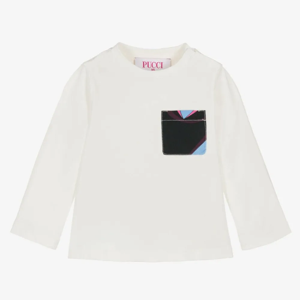 A white top for girls by Italian designer PUCCI, made in soft cotton jersey. The luxury brand, known for their vibrant, bespoke patterns, has styled this top with a blue, pink and black Onde-print patch pocket on the front and stand-out branding printed on the back. Poppers on one shoulder help with over-the-head dressing.