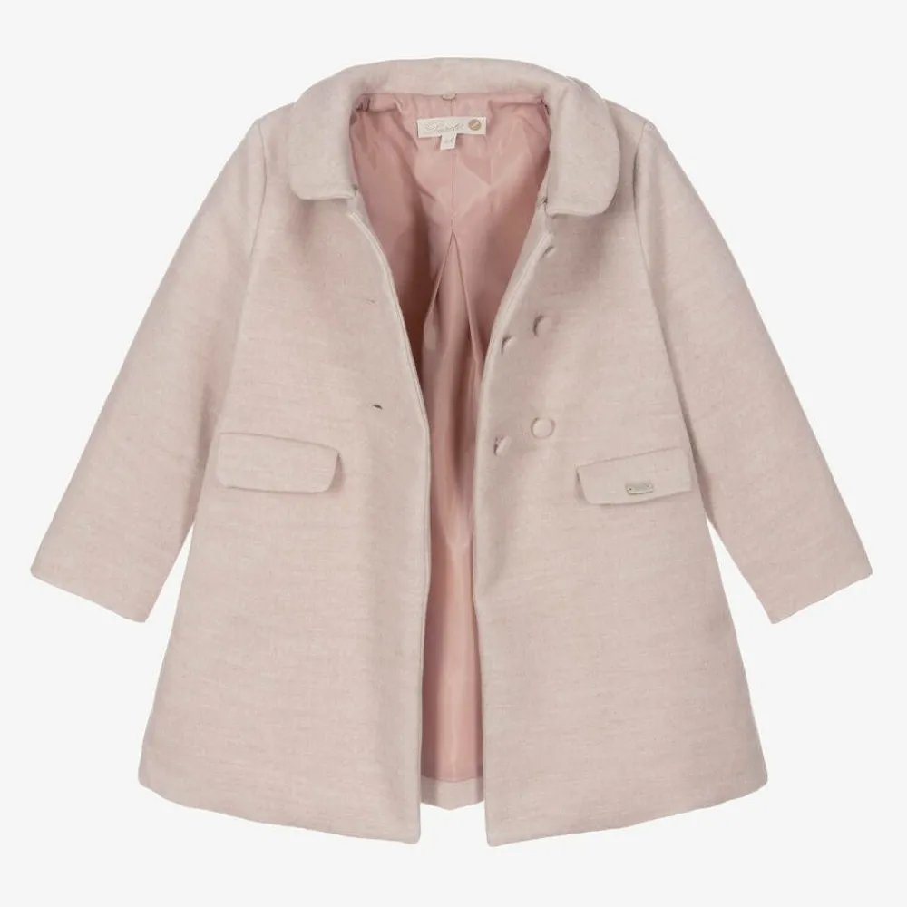 A lovely pale pink coat for younger girls by Pureté Du… Bébé, made in beautifully soft fabric with a felted feel. Lined in silky satin, this traditionally-styled coat has double-breasted button fastenings and a collared neckline. There are two decorative pockets on the front, one of which is branded with a pearlescent logo charm. For a different look, the coat comes with a detachable faux fur collar which attaches to the neckline with elasticated loops and hidden buttons.