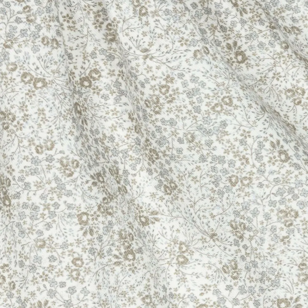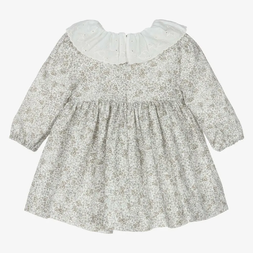 Lovely white cotton dress for younger girls by Pureté Du… Bébé, with a delicate green and blue floral design. This sweet dress has a pretty, white, ruffled, embroidered collar and a shirred bodice trimmed with a little mother-of-pearl logo charm. It has gently elasticated cuffs, a comfortable voile lining and fastens neatly on the back with a concealed zip.