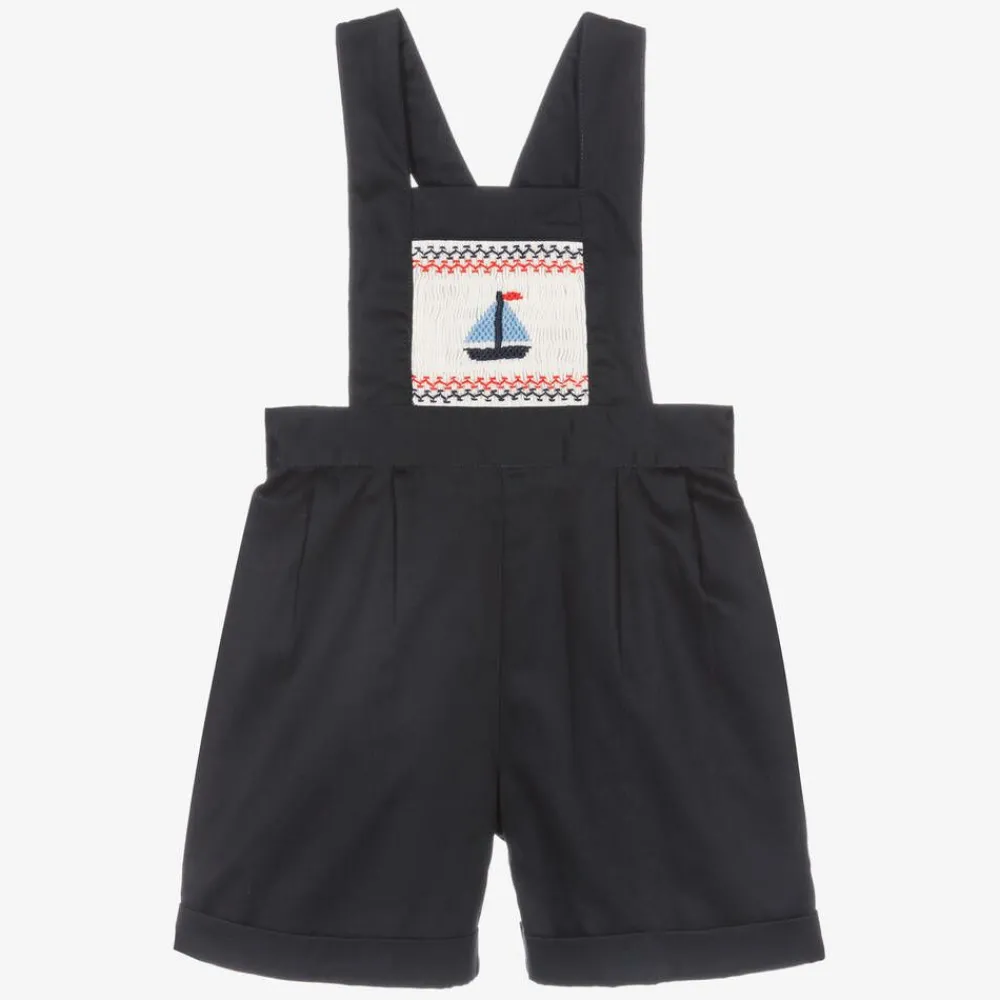 Baby boys navy blue cotton dungaree shorts from British designer Rachel Riley. There is a smocked panel on the front with a charming hand-embroidered sailboat in red and blue. These classic-styled lightweight dungarees have cross-over straps, which fasten with buttons at the back. These can be adjusted as your child grows. Fully lined, the back is elasticated for all-day comfort.