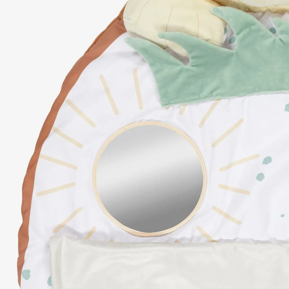Softly cushioned playmat for baby boys and girls by Rainbow Designs, featuring a plush Baby Simba from Disney's The Lion King. Full of fun colours, sounds and textures, this charming mat provides a comfortable surface that encourages tactile exploration and early sensory development through play. Little ones can catch their reflection in the baby-safe mirror and lift the large crinkly-sounding leaf to reveal Simba and Nala sleeping peacefully beneath. Once playtime is over, the mat can easily be rolled up and put away.