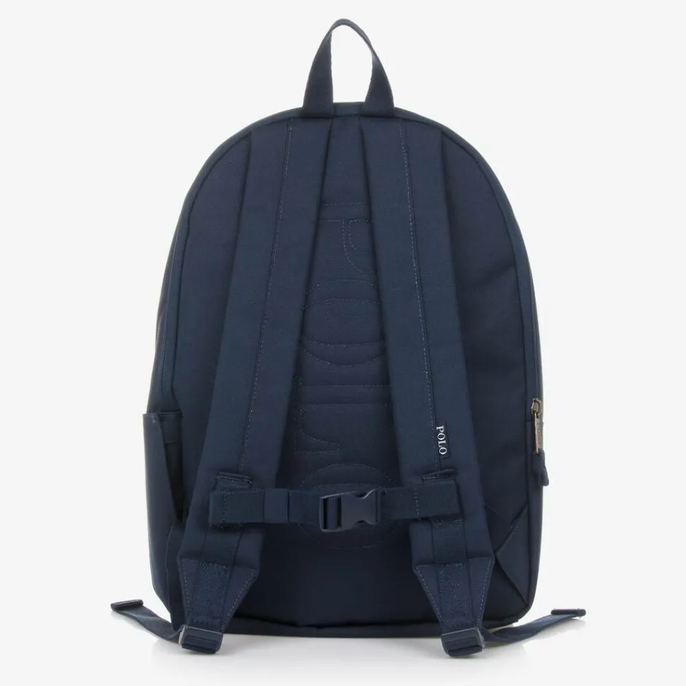 A spacious navy blue backpack for boys by Ralph Lauren, made in durable recycled canvas. It has two compartments, the main one has an internal mesh pocket and the other has a useful laptop pocket. There is an external zipped pocket on the front and a useful water bottle pocket on one side. Ideal for use as a school bag, it has padded, adjustable shoulder straps, with a buckle fastening chest strap for extra support. There is a subtle Polo logo on the back and the brand's signature pony logo embroidered on the front in red.