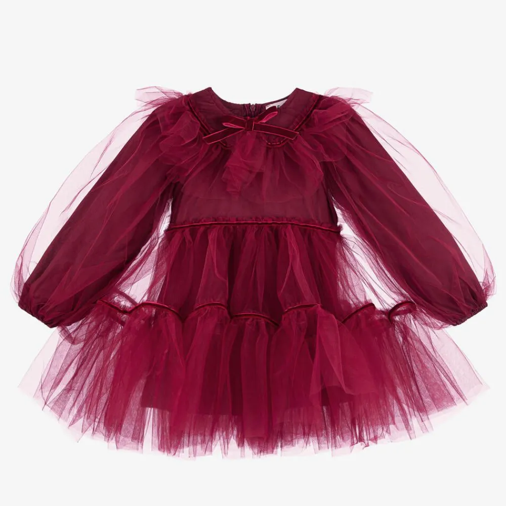 Deep red dress for girls by London-based designer, RaspberryPlum. Made in fine tulle with exaggerate volume, this striking trapeze dress has long, puffed sleeves, a tiered skirt, and lustrous velvet trims. It has a soft cotton lining, ideal for comfort during those special, stand-out occasions.