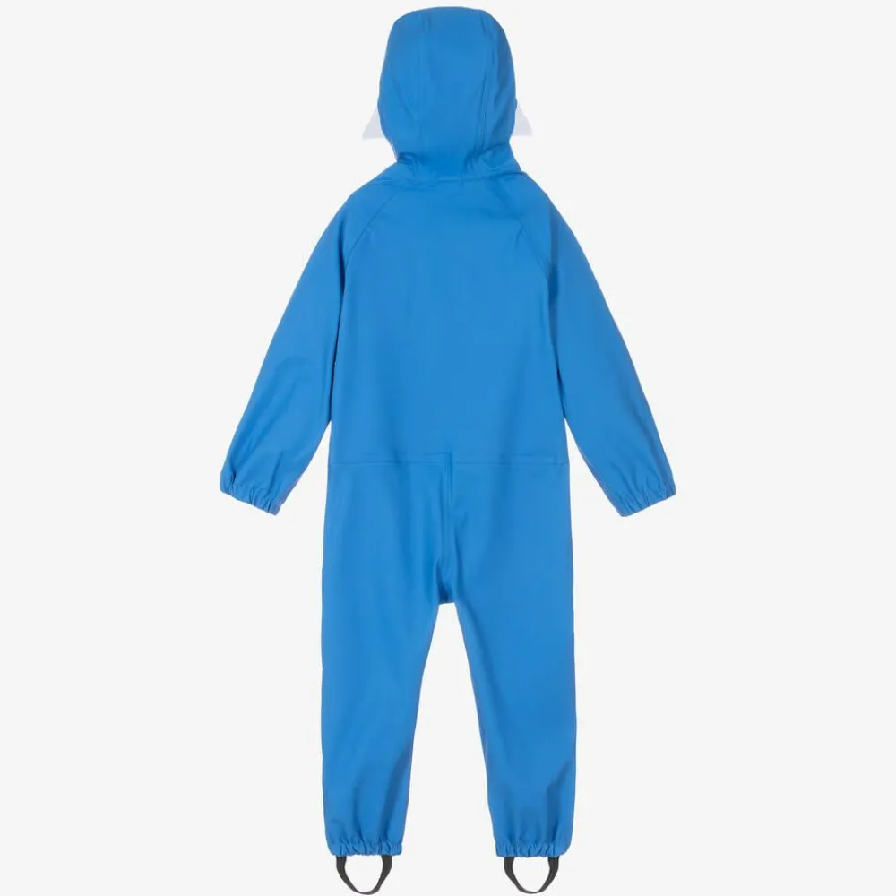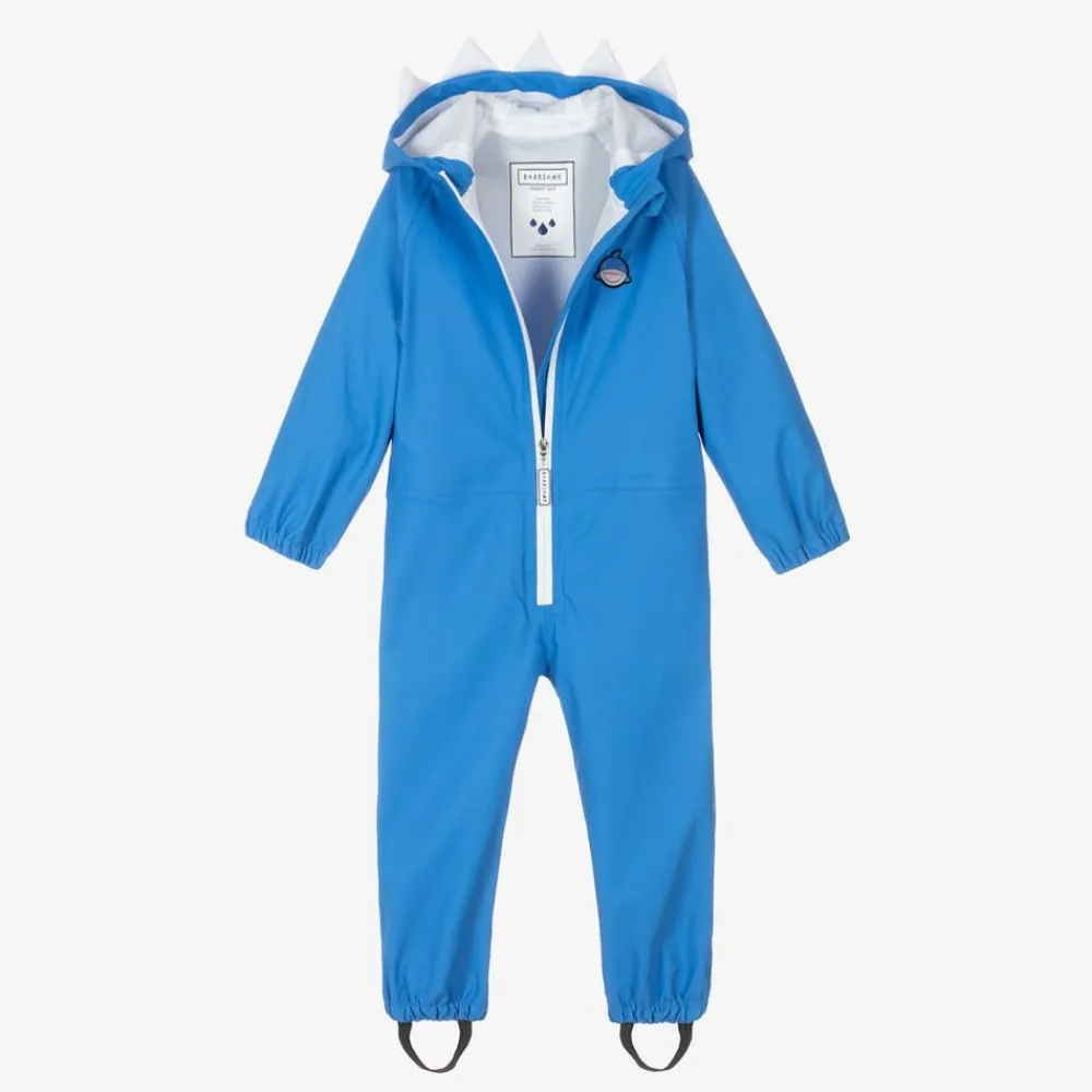 A fun blue rainsuit for boys by outerwear brand Roarsome, made in smooth waterproof fabric. In keeping with it's fun character theme, it has white 3D shark teeth on the hood and a rubberised motif on the chest. Designed for comfort and to keep your child dry during wet weather adventures, it features taped seams and aqua seal zips. Great for jumping in puddles, it has removable elasticated foot straps that attach with poppers.