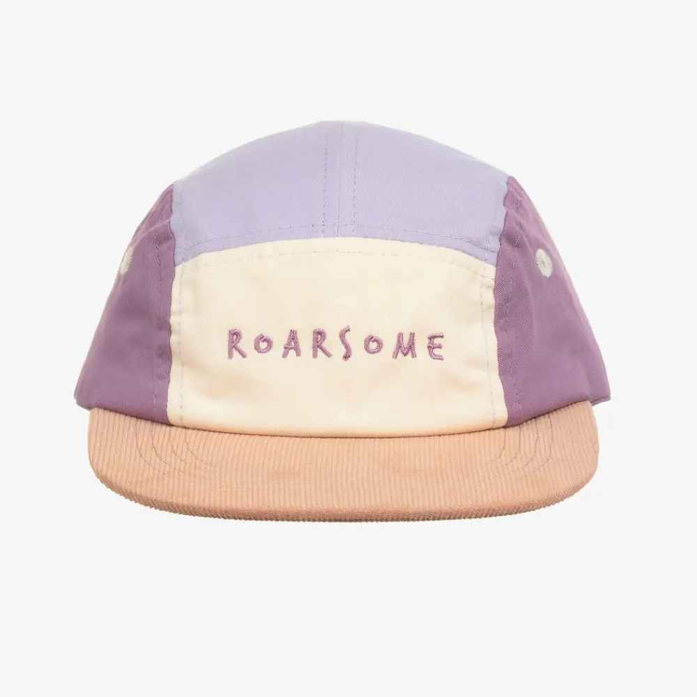 In a purple and ivory colourblock, this organic cotton cap for boys and girls is by Roarsome. Woven in smooth twill, it has a pink cord peak and a velcro strap to adjust the fit. For a signature finish, an embroidered logo is on the front, with 'Adventure Club' on the back.