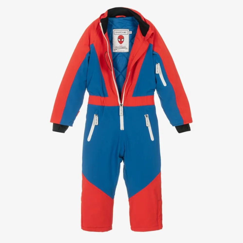 Fun Spiderman ski snowsuit for boys and girls by Roarsome, with a Spiderman velcro patch on the front and the character's eyes on the detachable hood. Sure to keep everyone cosy on the slopes, this technical all-in-one has internal thumb cuffs and gaiters for extra protection against the cold and snow. There is a useful ski pass pocket on one sleeve and an elasticated waist for a good fit.