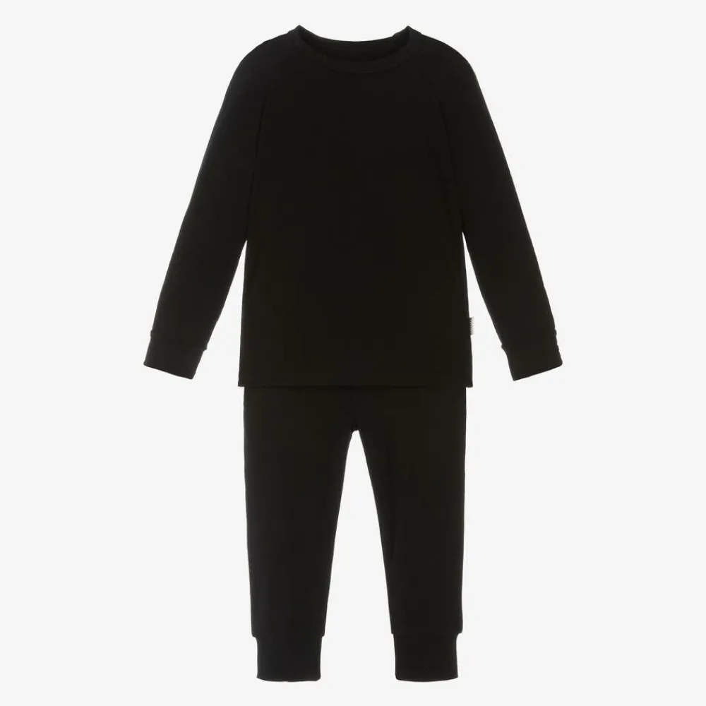 A black base layer set for boys and girls from British label Roarsome. Both items are made in beautifully soft, stretchy and comfortable bamboo jersey with temperature-regulating natural qualities. The top has long raglan sleeves for freer movement. The bottoms are snug-fitting with an elasticated waist to ensure quick and simple dressing.