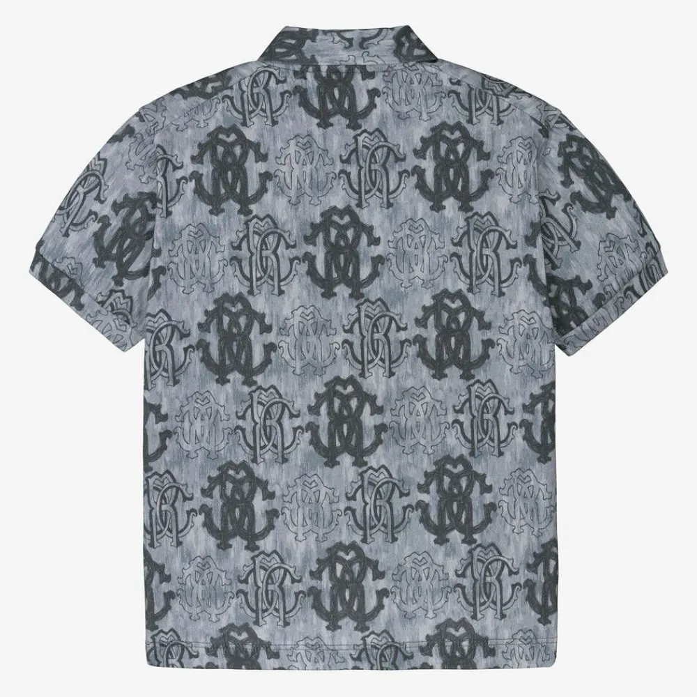 Blue polo shirt for boys by luxury Italian brand Roberto Cavalli, made in soft cotton jersey. For a distinctive look, it is patterned in the designer's recognisable RC monogram, with a logo tab stitched on the chest. It has a pointed collar and fastens with silver metal branded buttons at the front.