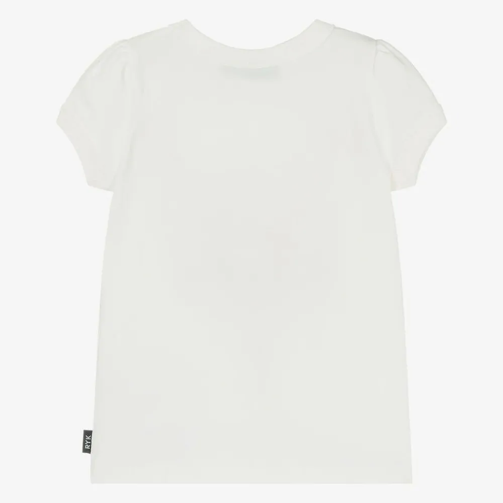 Ivory T-shirt for girls by Rock Your Baby, made in soft cotton jersey. The front is printed with a pretty floral design in pink, blue and green. This casual tee has short puffed sleeves and stretchy ribbed trims.