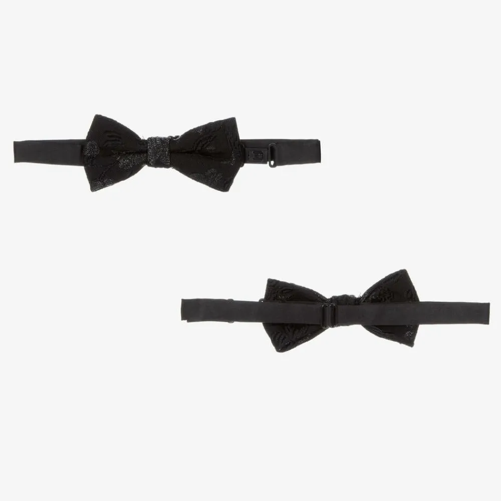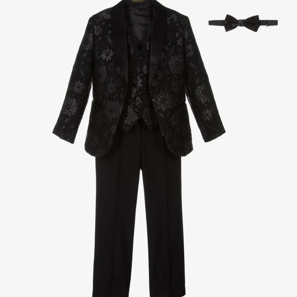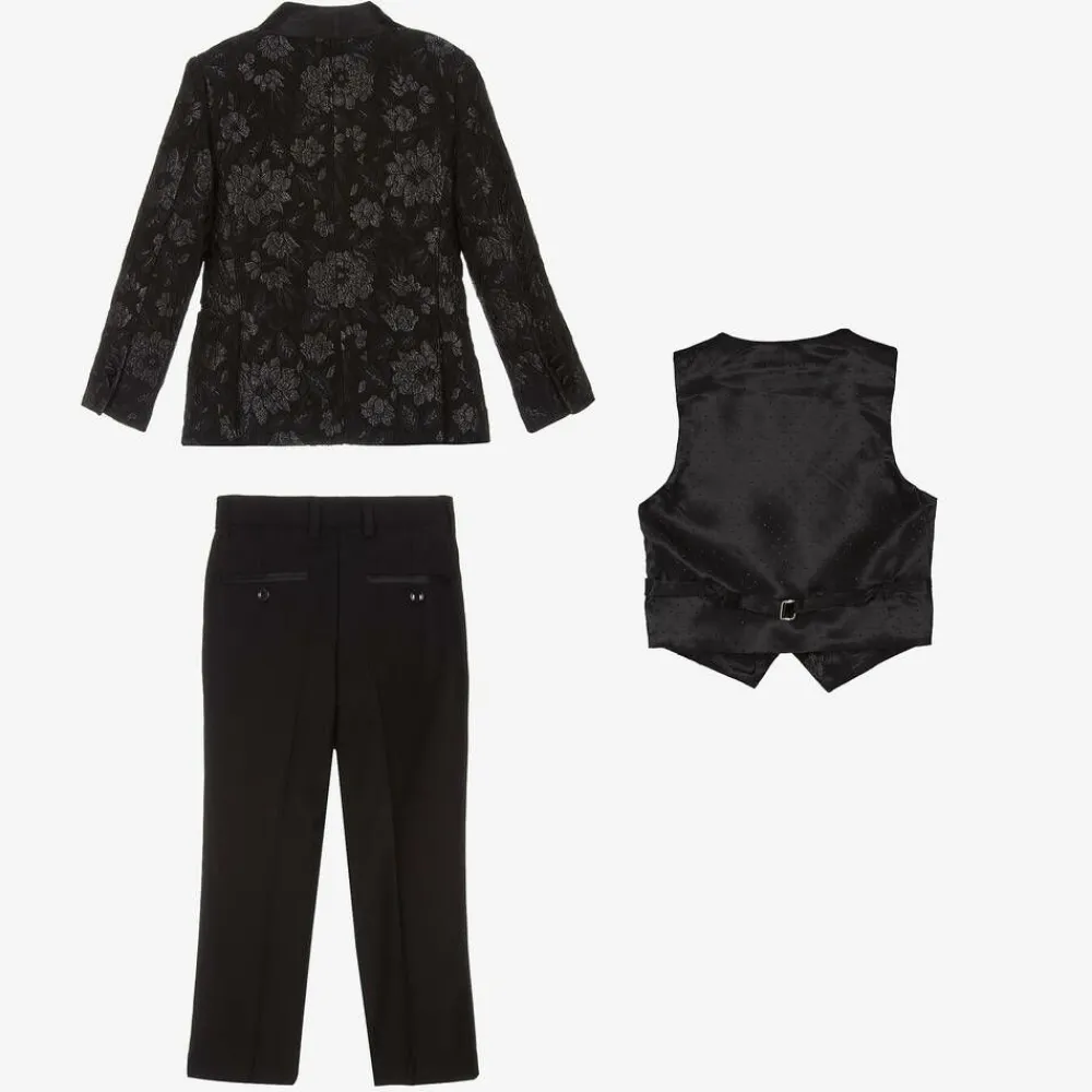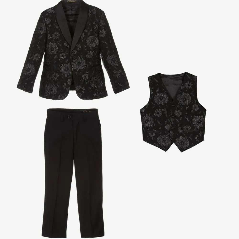 From the luxury collection, a smart black suit for boys by Romano, hand-tailored in a floral jacquard with a subtle silver lurex weave. Great for special occasions, the tuxedo jacket has a black satin shawl lapel with a matching single button fastening and jetted pocket trims. The matching waistcoat has button fastenings on the front and a tonal polka dot design on the back. The adjustable buckle strap on the lower back allows for a great fit. A pair of black twill trousers and an adjustable bow tie complete the coordinated look.