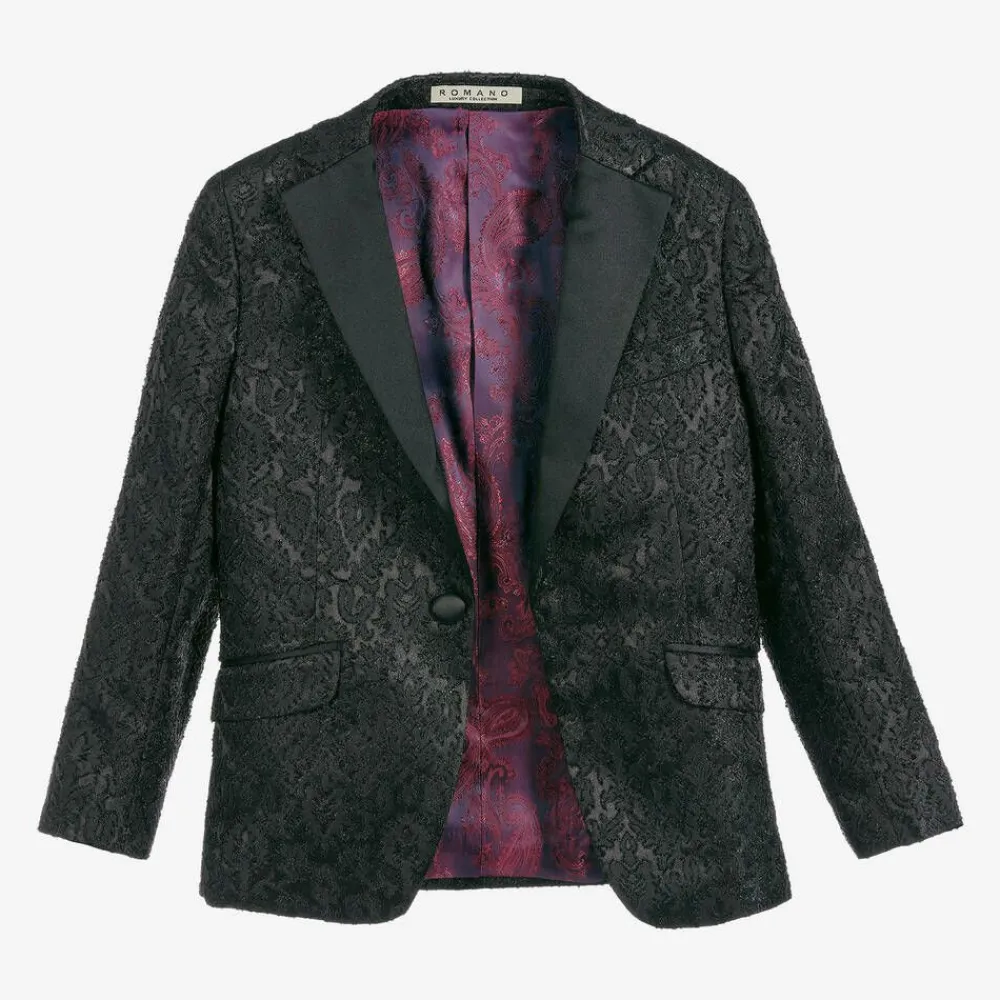 A special occasion suit for boys by Romano. The black jacquard jacket has smart satin lapels and is lined with a sumptuous red and purple damask satin. The waistcoat has a matching damask back with an adjustable strap. Both fasten with satin covered buttons. The black trousers have an adjustable waist for a comfortable fit, with a button, zip, hook and eye fastening.