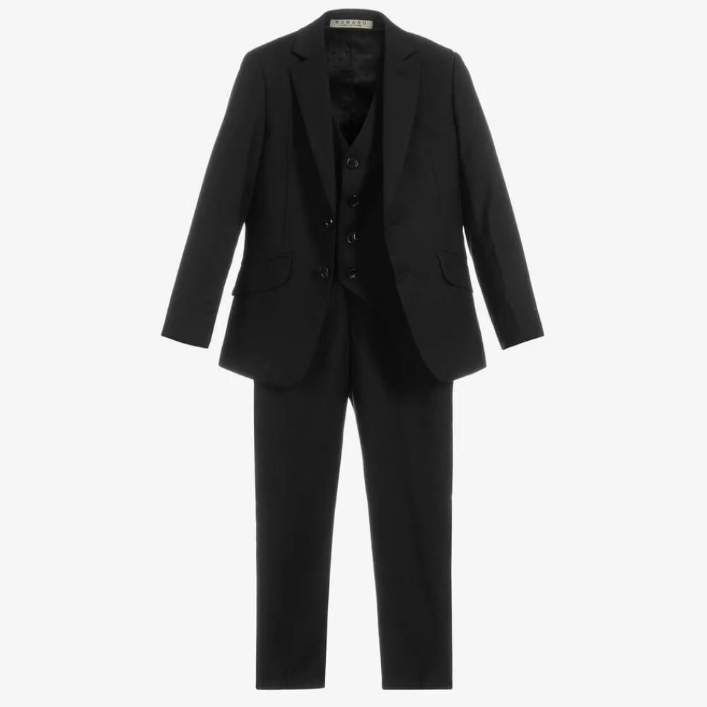 A smart and elegant black suit for boys by Romano, made in a soft viscose blend. The jacket has a silky lining, patterned in jacquard dots to match the back of the waistcoat. The trousers are elasticated at the back of the waist for a comfortable fit, with a zip, hook and eye fastening on the front. The suit comes in a wide age range, so is ideal for pageboys.