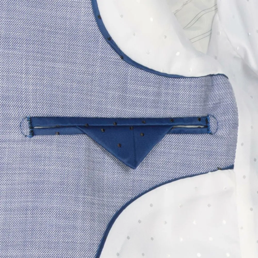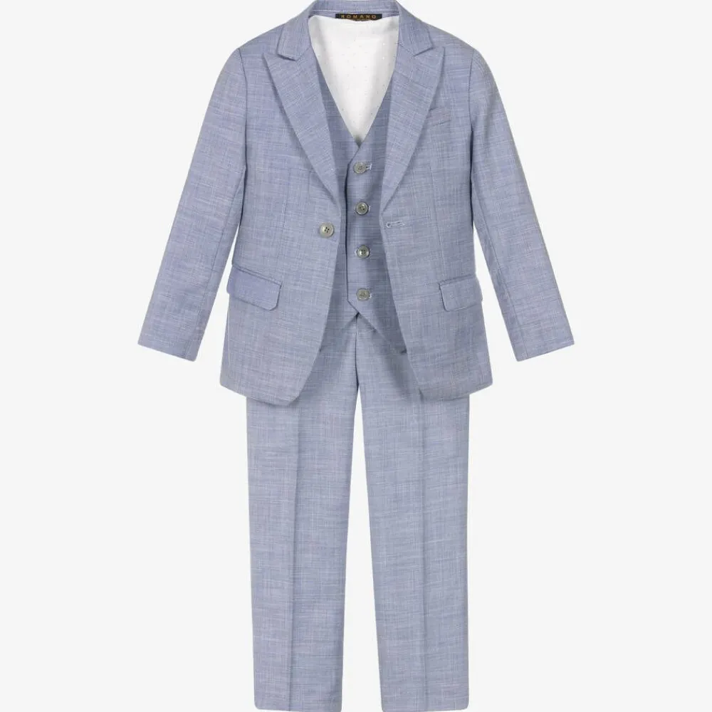 From the Romano luxury collection, a smart blue suit for boys made in soft twill. The blazer has a traditional lapel collar, three front pockets two of which have a flap closure and an internal pocket. The waistcoat has button fastenings on the front and a silky satin back, that matches the blazer lining, for comfort. The waistcoat can be adjusted with a buckle strap on the back for a better fit. To complete the look, the blue trousers have a smart pleat on the front and an adjustable waist for growth.