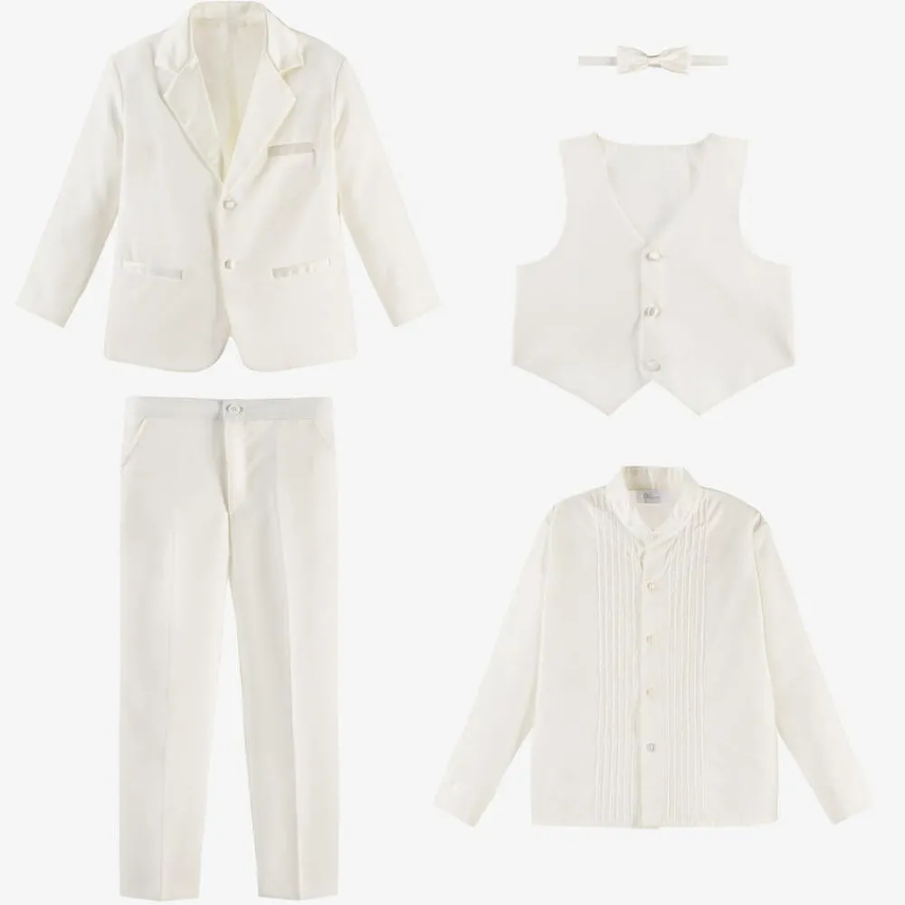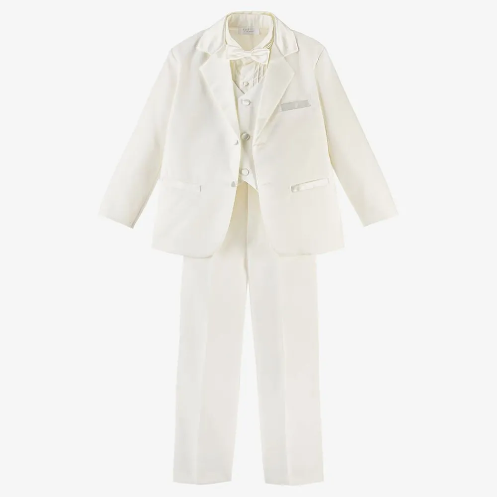 Boys ivory special occasion tuxedo suit by Romano. This elegant suit comprises a jacket, elasticated waist trousers, pintuck shirt, bow tie and waistcoat. The jacket has satin lapels, pockets and covered buttons. The trousers fasten with a button and have an elasticated waistband, with satin stripes down each side.