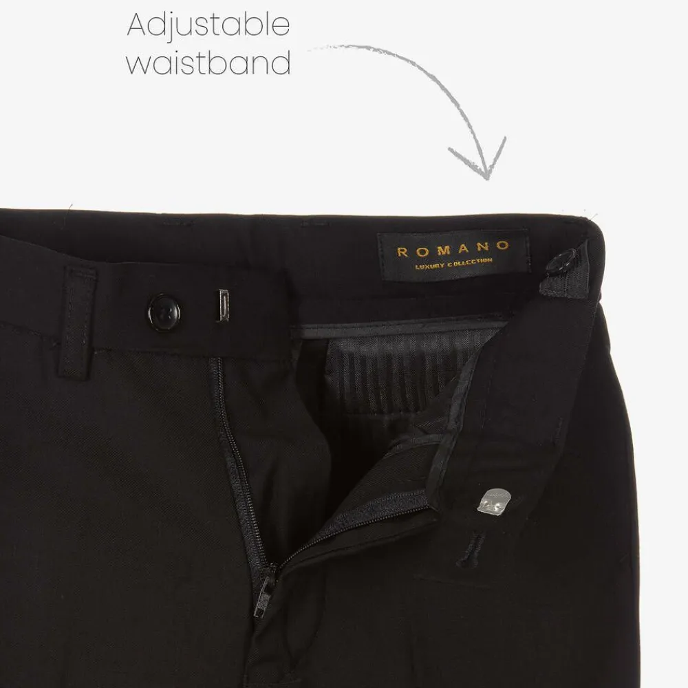 From the luxury collection, a smart red and black suit for boys by Romano, hand-tailored in a silky paisley jacquard. Great for special occasions, the single-breasted tuxedo jacket has a black satin shawl lapel with a matching button fastening and jetted pocket trims. The classic white shirt has front button fastenings, a curved hem, and a pointed collar. A pair of black twill trousers with an adjustable waist complete the coordinated look.