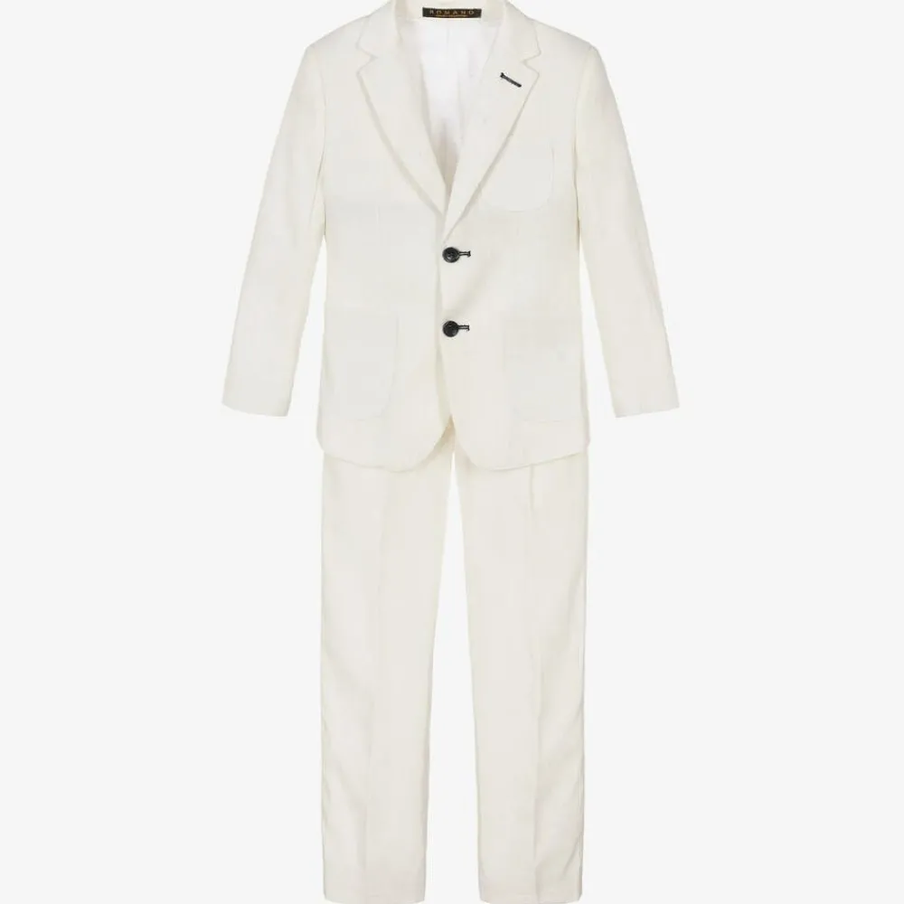 An elegant off-white trouser suit for boys by Romano, made in comfortable linen and cotton blend. The single-breasted jacket is lined in silky satin for a luxurious feel, with vents on the back for ease of movement. There are front patch pockets, grey elbow patches on the sleeves, and button trims on the cuffs. The trousers have front and back pockets, a zip, hook and eye fastening, and an adjustable waist for an ideal fit.