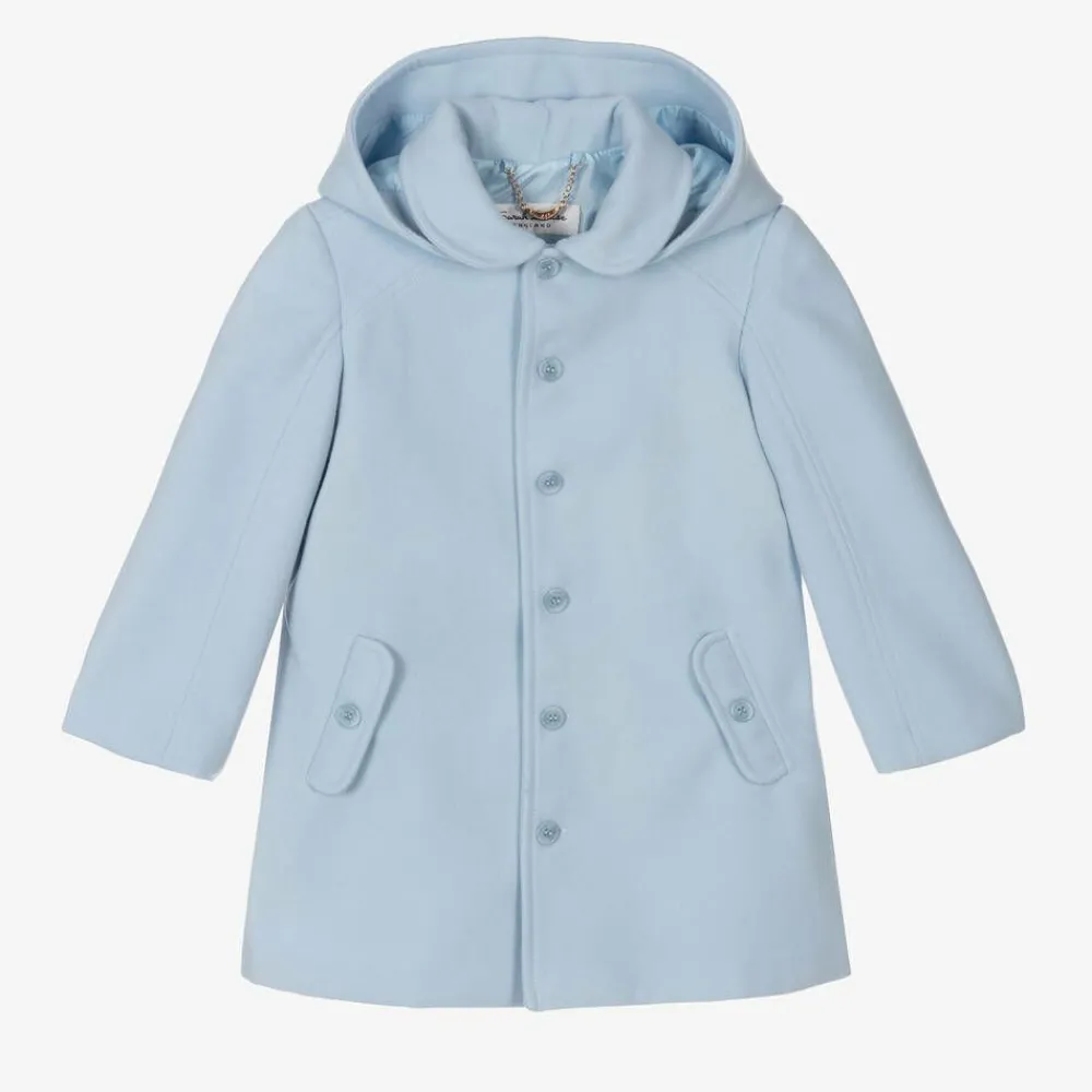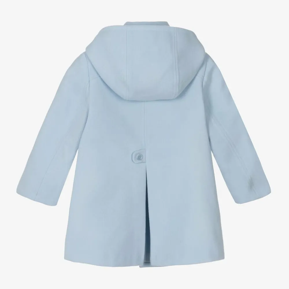 Pale blue coat for little boys by British designer Sarah Louise. This traditional design is made in a beautifully soft, brushed viscose blend with smart marbled front button fastenings, a silky-soft lining, and button-closing side pockets. Versatile and classically styled, the hood is removable, attaching with buttons.