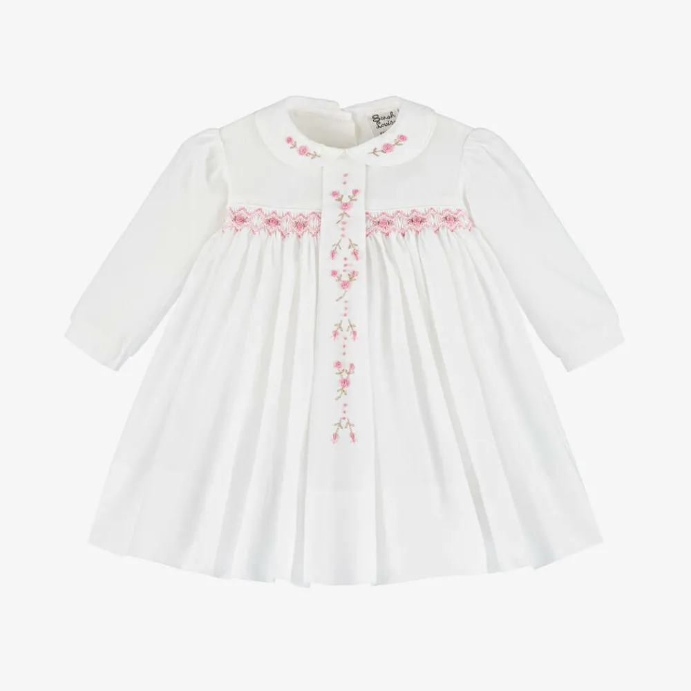 A sweet ivory dress for baby girls by Sarah Louise, made in a soft cotton blend with a Peter Pan collar. Lightweight and gentle on the skin, this romantic design is delicately hand-smocked on the front with gorgeous pink, hand-embroidered rose buds adding an extra special touch. The long sleeves gently gather on the shoulders and button on the cuff. The dress is comfortably lined and fastens neatly on the back with pearlescent buttons. Older sizes have a sash fastening on the back as well as buttons.