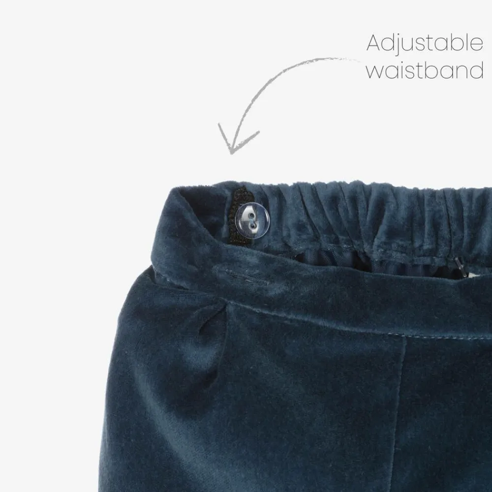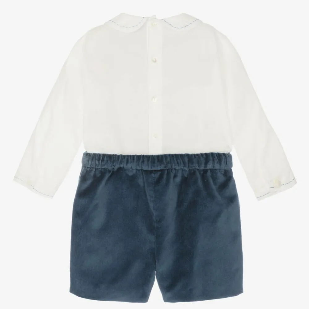 Traditionally styled ivory and navy blue buster suit for little boys by British brand Sarah Louise. Made in a comfortable cotton blend, the lightweight shirt is beautifully hand-smocked and hand-embroidered. The smart velvet shorts attach to the top with buttons for a neat, tucked-in finish and they have an adjustable waistband for a good fit.