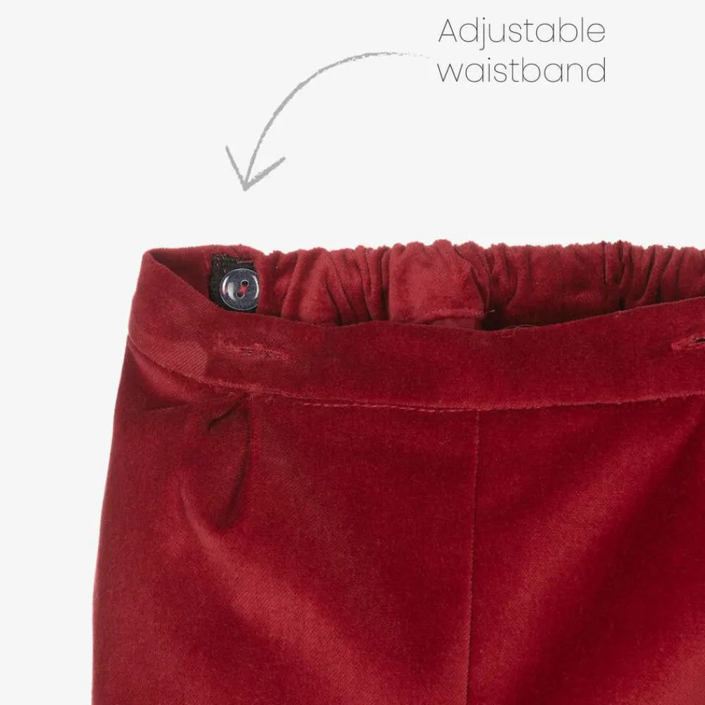 Traditionally styled ivory and red buster suit for little boys by British brand Sarah Louise. Made in a comfortable cotton blend, the lightweight shirt is beautifully hand-smocked and hand-embroidered. The smart velvet shorts attach to the top with buttons for a neat, tucked-in finish and they have an adjustable waistband for a good fit.