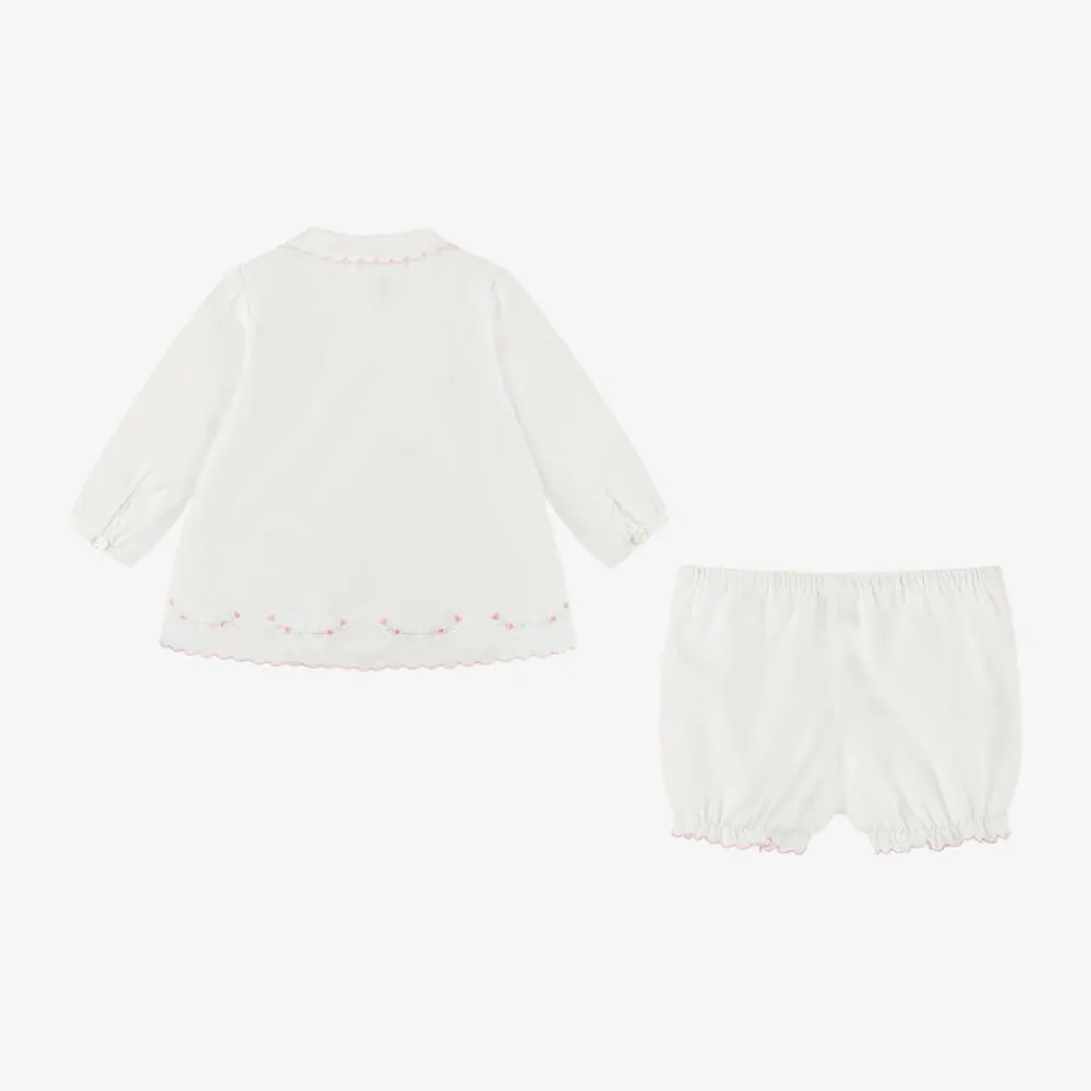 A white shorts set for little girls from Sarah Louise, made in soft polycotton. The blouse has sweet pink scalloped edges and hand-embroidered pink flowers. It fastens with mother-of-pearl buttons on the front and has front pleats. The matching bloomer shorts are gently elasticated for comfortable wear.