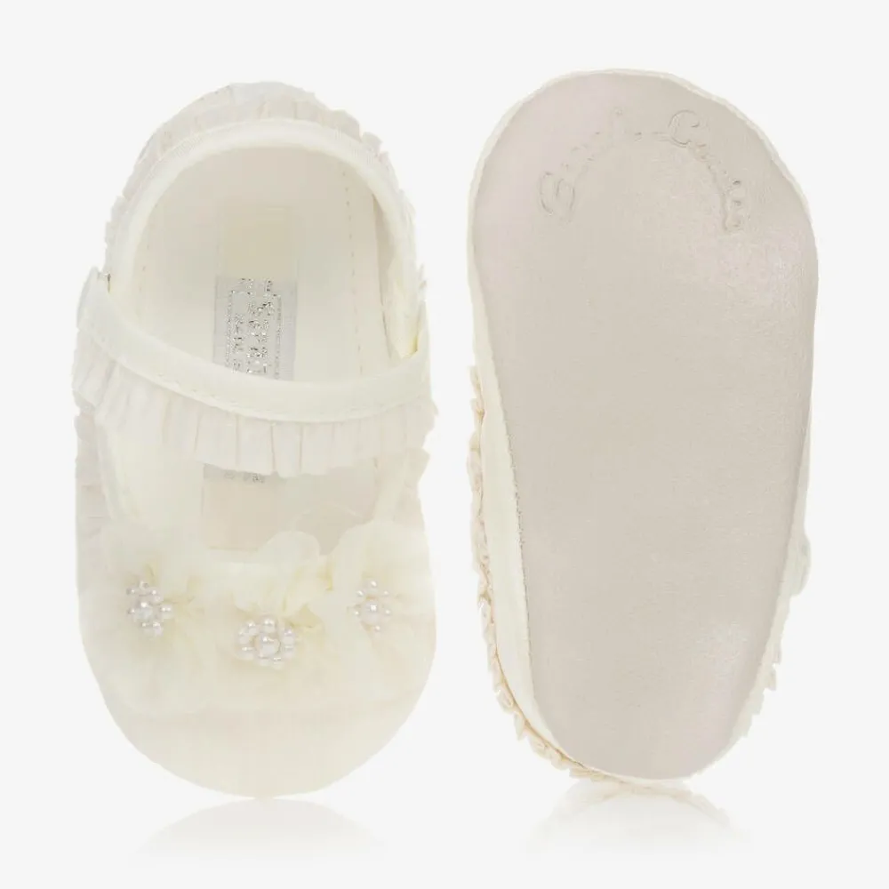 Sarah Louise ivory pre-walker shoes for baby girls, made from a silky taffeta with soft faux leather outsole. They have pretty frills and organza flowers with pearly beads. The straps fasten with easy poppers.