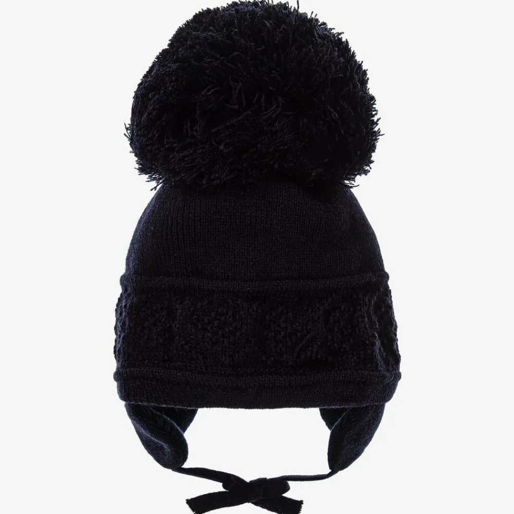 A navy blue beanie for little boys and girls by Sätila of Sweden, in a soft and cosy knit. It has a lovely chunky diamond pattern and a giant pom-pom on the top for a charming look. Shielding them in colder weather, the hat is finished with ear flaps and ties neatly under the chin.