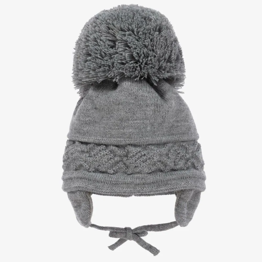 A grey beanie for little boys and girls by Sätila of Sweden, in a soft and cosy knit. It has a lovely chunky diamond pattern and a giant pom-pom on the top for a charming look. Shielding them in colder weather, the hat is finished with ear flaps and ties neatly under the chin.