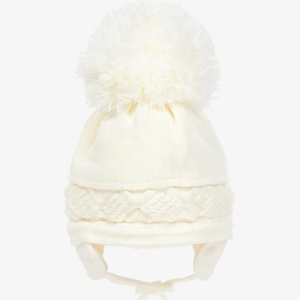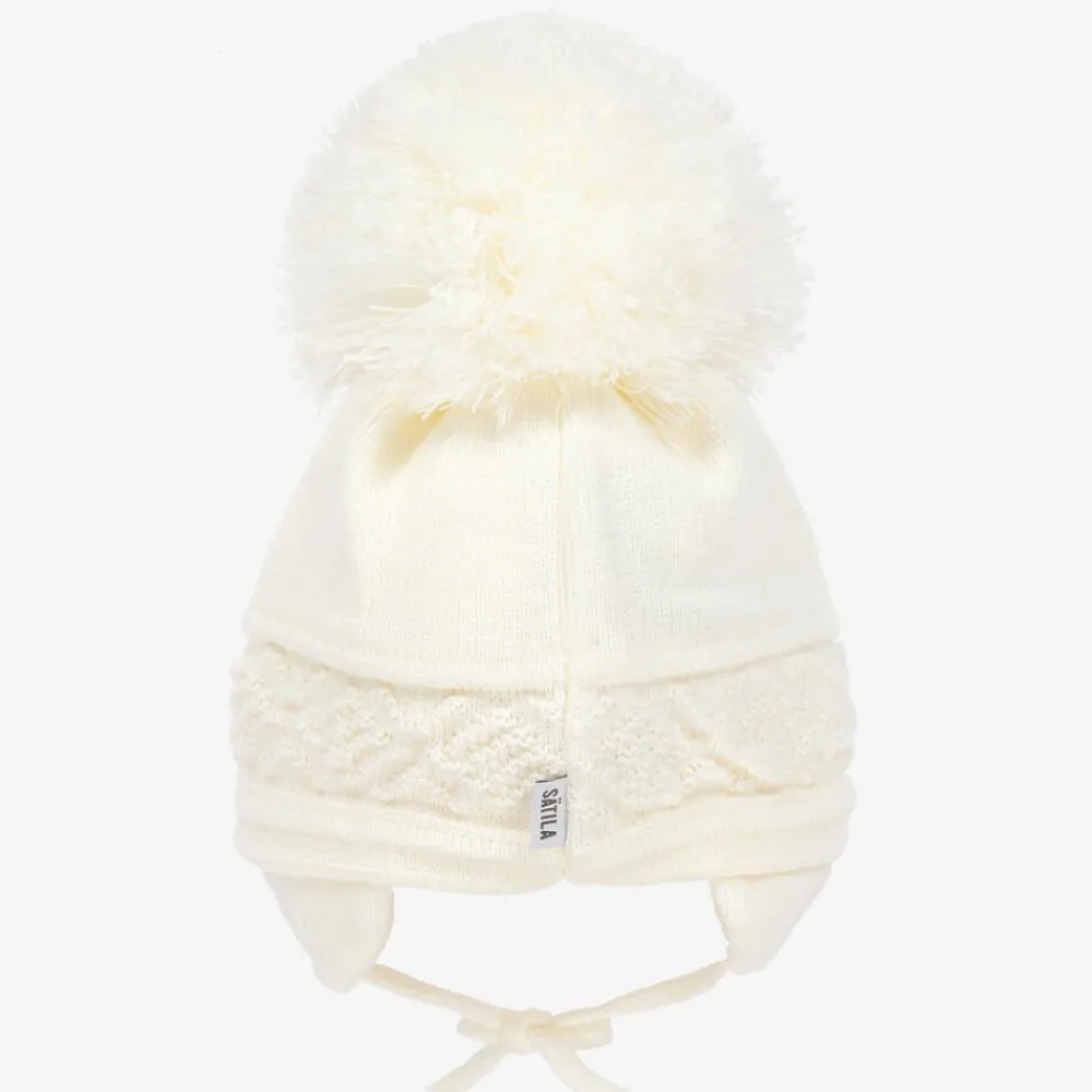 An ivory beanie for little boys and girls by Sätila of Sweden, in a soft and cosy knit. It has a lovely chunky diamond pattern and a giant pom-pom on the top for a charming look. Shielding them in colder weather, the hat is finished with ear flaps and ties neatly under the chin.