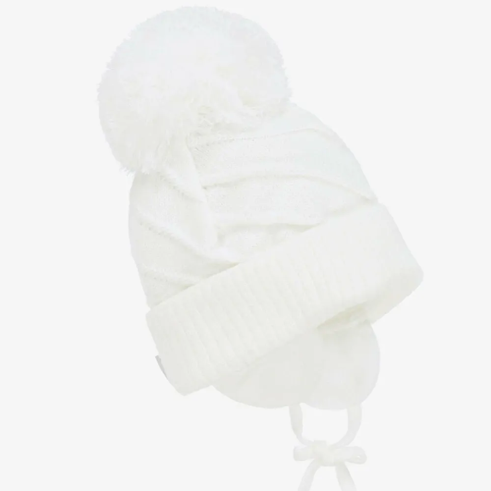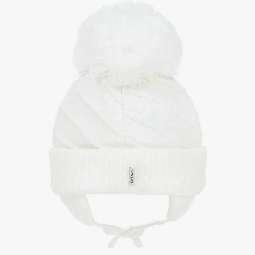 A white winter hat for boys and girls by Sätila of Sweden, made from a chunky knit with diagonal rib detailing. For a cute look, it has a giant pom-pom on top, a turned-up brim, and charming ear flaps with ties that fasten under the chin. It is partially lined in knitted cotton for additional warmth and comfort.