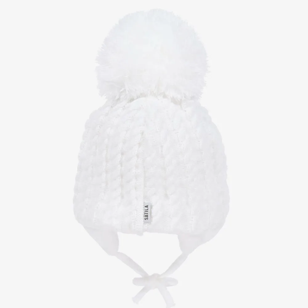 A white beanie for little boys and girls by Sätila of Sweden, in a lovely cable knit design. It has a giant pom-pom decoration and ear flaps with ties that secure under the chin to keep them super cosy. For extra comfort and warmth, the hat is lined in soft cotton jersey.