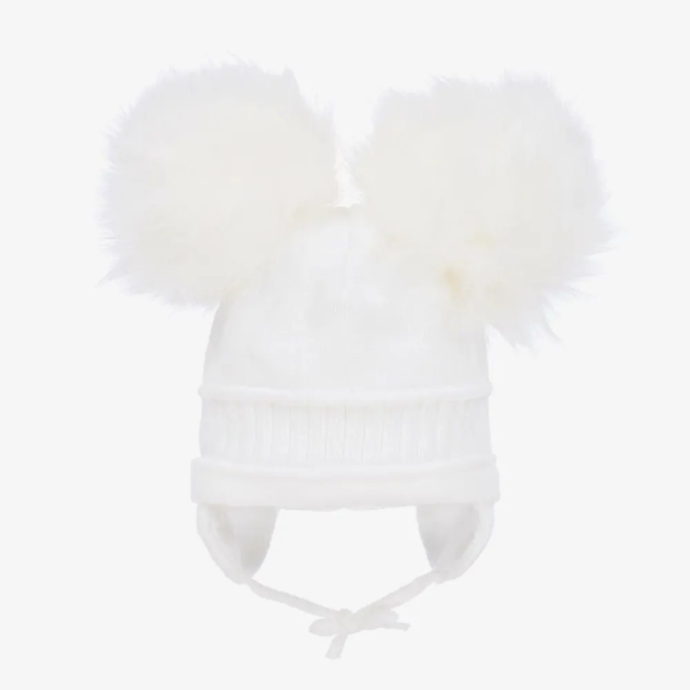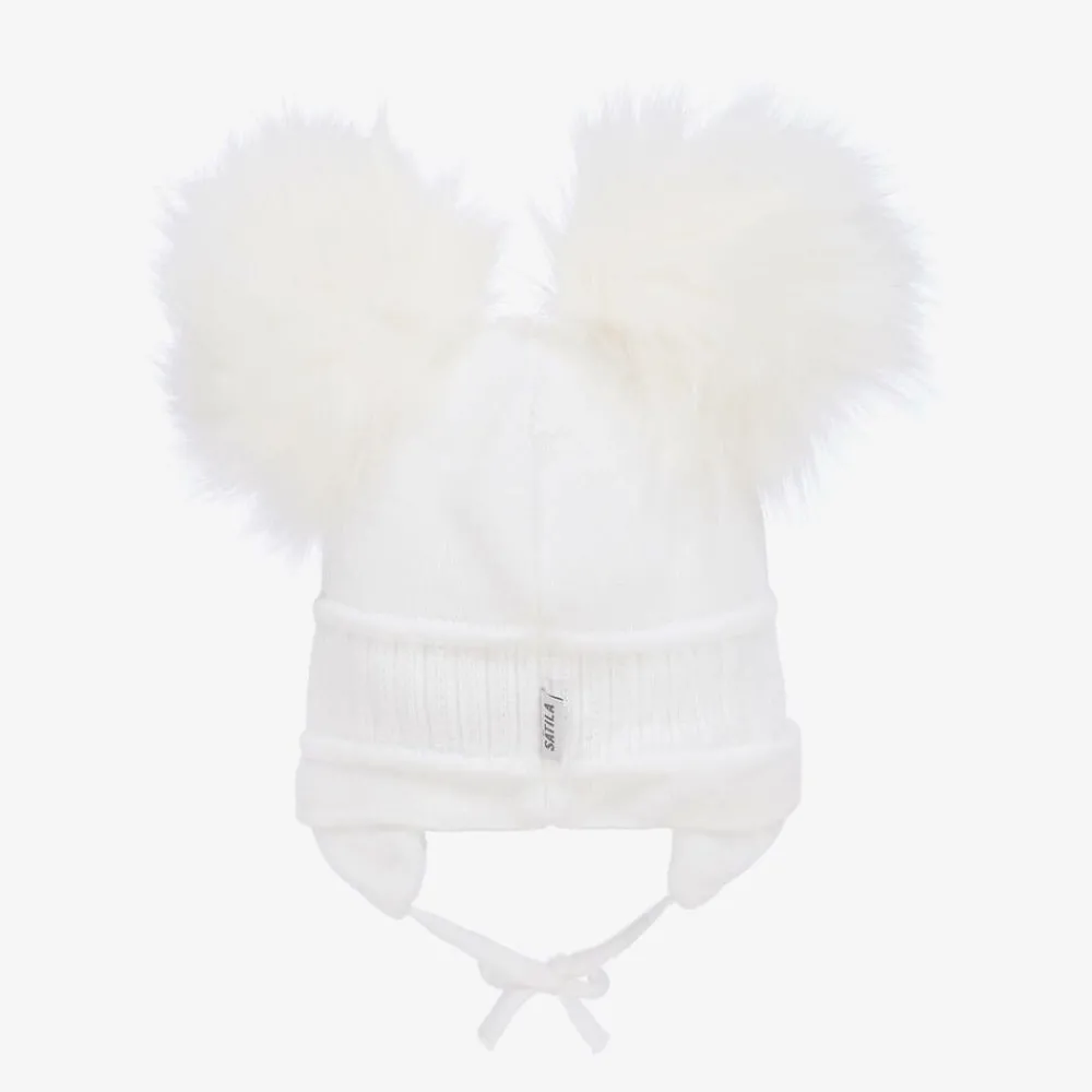 Absolutely adorable, this white winter hat for little boys and girls is by Sätila of Sweden. Made from a soft knit with a ribbed panel, there are two large faux fur pom-poms on top for a cute look. Lined in lightweight cotton jersey for extra comfort, it has sweet ear flaps with ties that fasten under the chin.