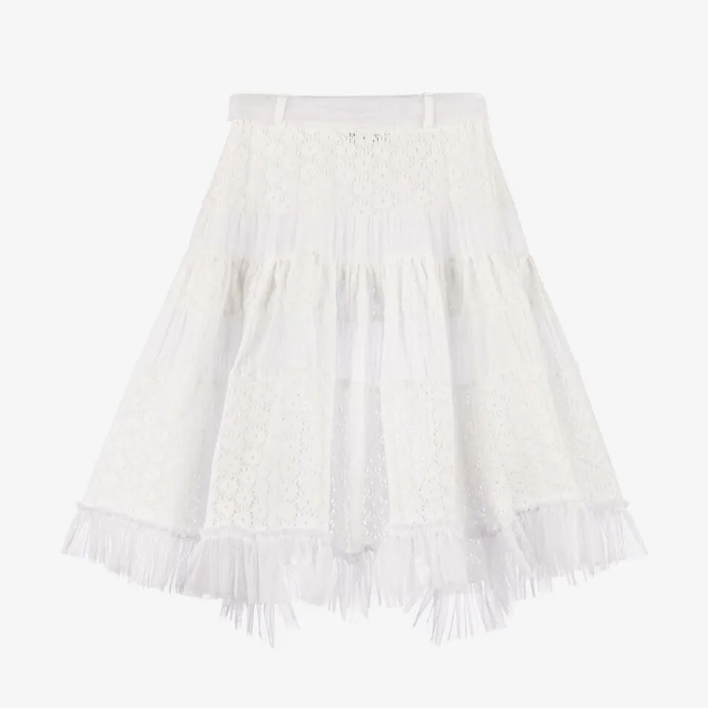 A beautiful white cotton beach skirt for girls by Selini Action, ideal as a poolside cover-up. Trimmed with tulle ruffles, this handmade skirt is designed with delicate lace-knit and sheer voile panels. It has a fun high-low hemline and an elasticated waistband with a removable tulle belt to tie in a bow at the front.