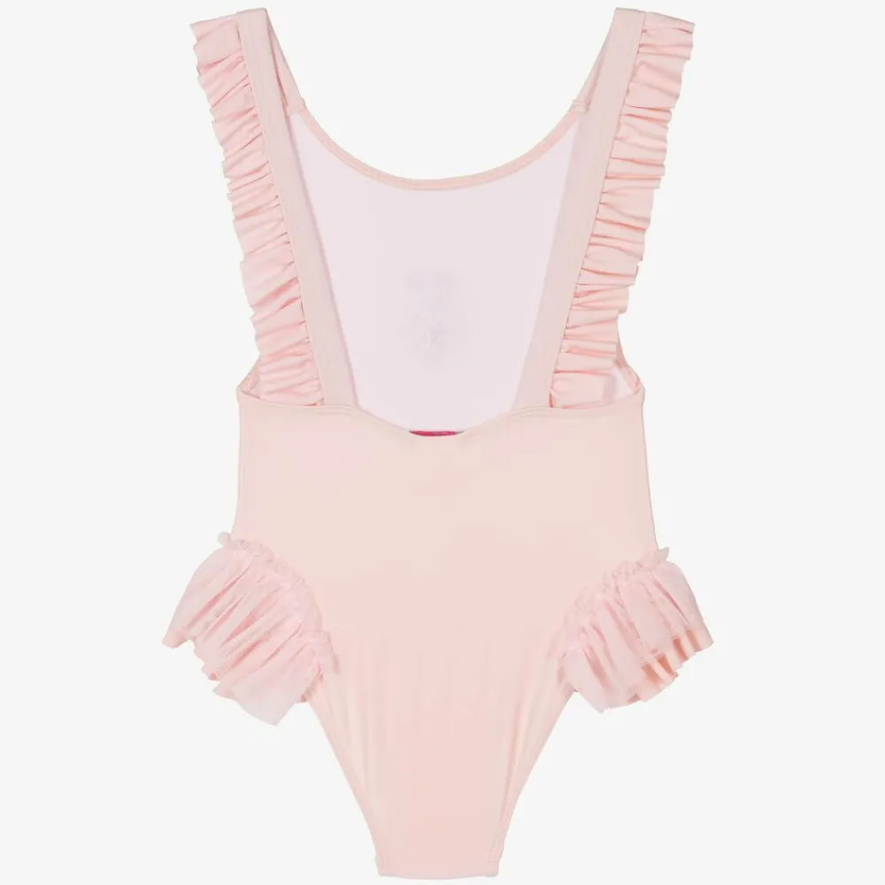 Super cute pale pink swimsuit for girls by Selini Acton, with a little teddy bear embellished with diamantés and a flower on the front. Handmade, it is soft, silky and stretchy, with ruffled detailing and tulle frills on the legs.