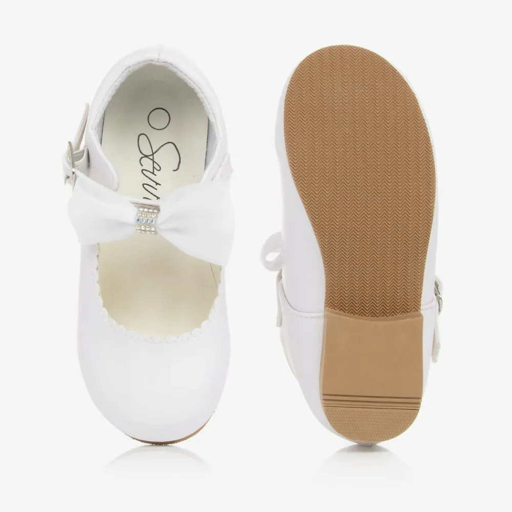 Charming white shoes for girls by Sevva, made in smooth faux leather. These classic Mary Jane style shoes have a buckle-fastening strap adorned with a diamanté organza bow adding an elegant touch of sparkle.