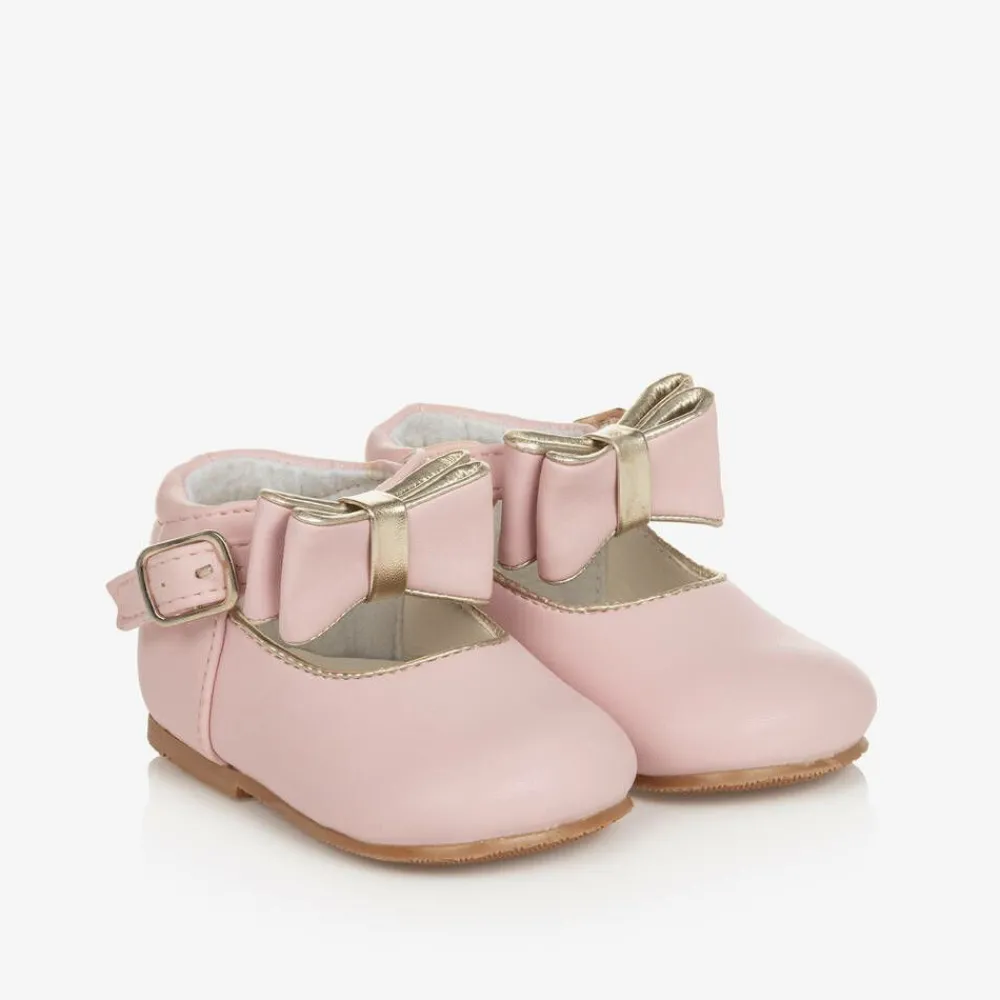 Lovely pink faux leather Mary Jane style shoes for little girls by British brand Sevva. There is a pretty bow with gold trims decorating the buckle fastening ankle strap. Soft and comfortable, they are lined in soft faux leather with a gently cushioned insole and padded ankle cuffs. The non-slip rubber outsole improves grip when taking those little steps.